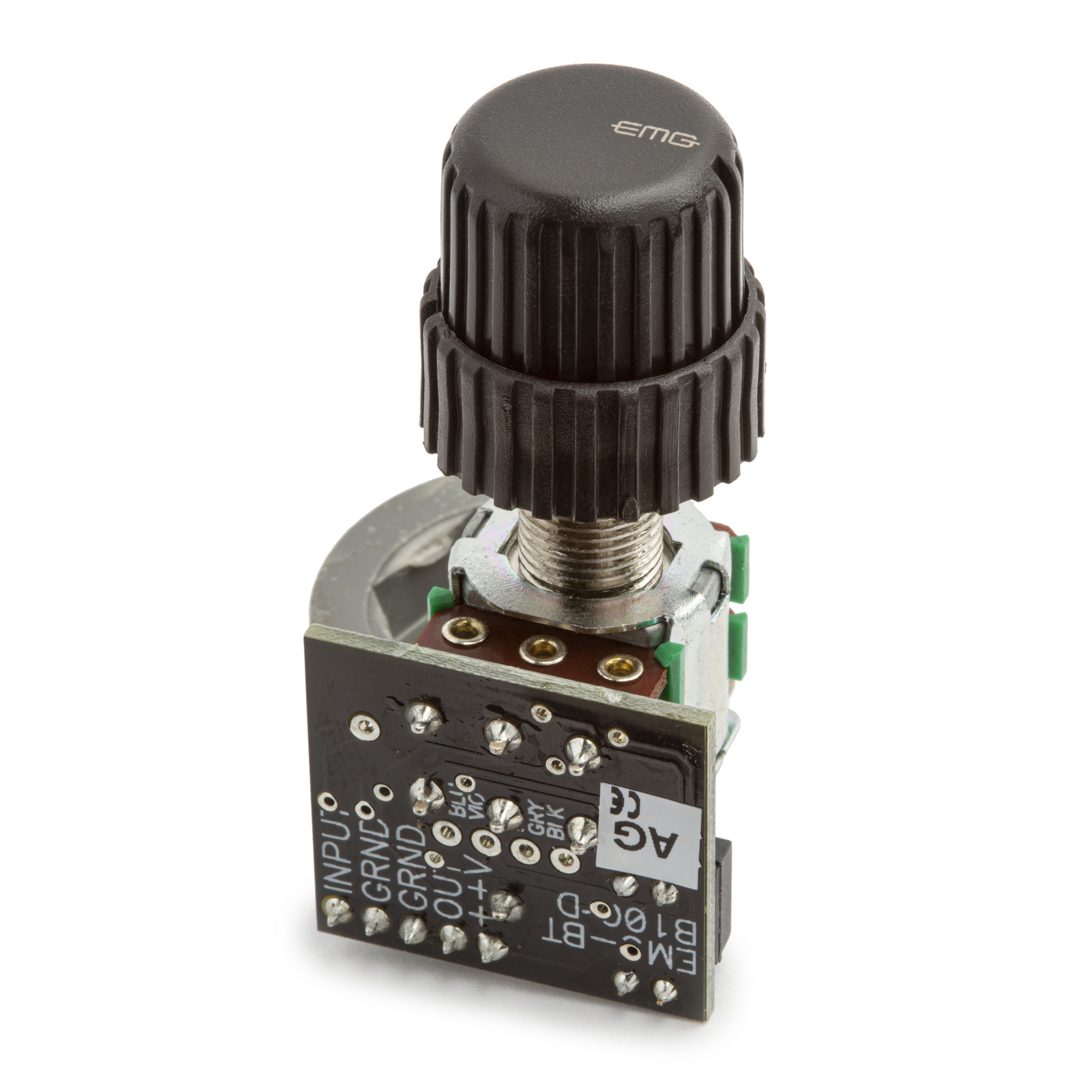 El control ABC está diseñado para recogidas activas EMG. Permite un equilibrio sin pérdidas entre dos recogidas y tiene un retén central para la posición media. Si está utilizando captadores pasivos EMG-HZ u otros captadores pasivos, querrá utilizar el control de equilibrio activo B125 que cuenta con entradas tamponadas para una impedancia de entrada más alta. - Ecualizador de 2 bandas BTC Control (B100) para guitarra bajo. El BTC cuenta con filtros unipolares para ecualización de banda ancha. A menudo, los filtros unipolares más amplios son los preferidos para los instrumentos musicales porque son menos selectivos, más fáciles en el oído y suenan más “músicos”. Una de las características del control BTC es un interruptor DIP de 2 posiciones que controla la pendiente de la respuesta de alta frecuencia. Al elegir una de las cuatro combinaciones, la respuesta de alta frecuencia se puede adaptar a su gusto. El control BTC tiene una alta impedancia de entrada y se puede utilizar con tomas activas o pasivas. Los controles de bajo y agudo se montan en un eje concéntrico y se incluyen perillas.
