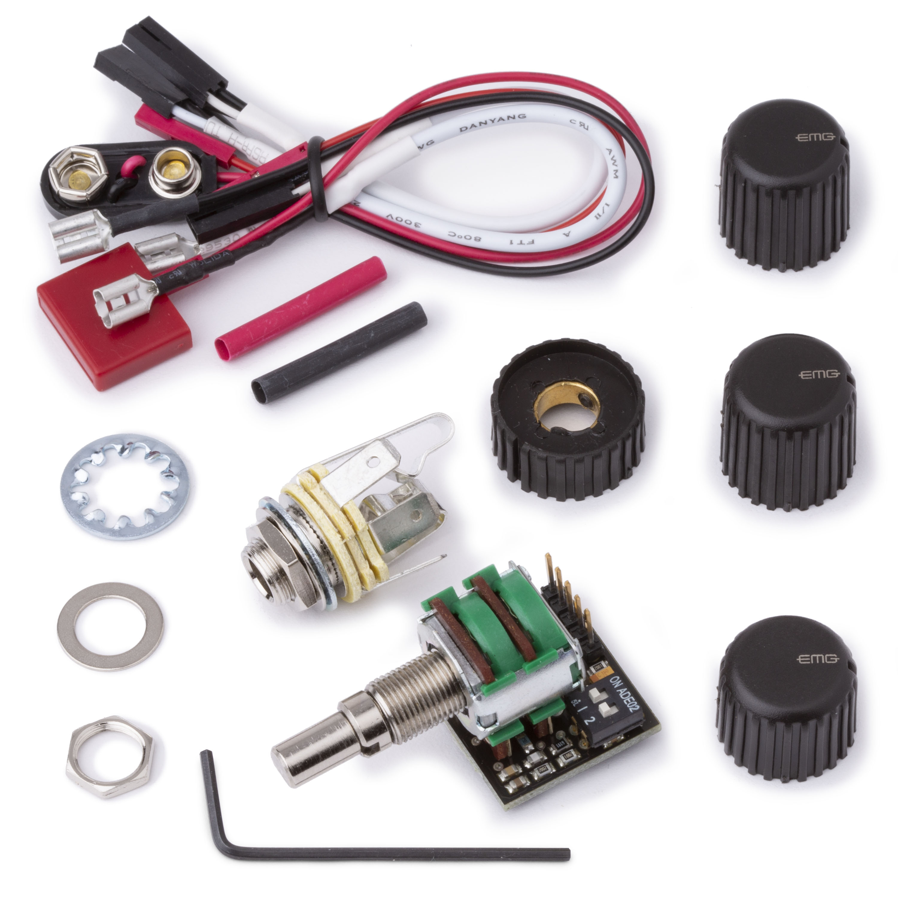El control ABC está diseñado para recogidas activas EMG. Permite un equilibrio sin pérdidas entre dos recogidas y tiene un retén central para la posición media. Si está utilizando captadores pasivos EMG-HZ u otros captadores pasivos, querrá utilizar el control de equilibrio activo B125 , que cuenta con entradas tamponadas para una impedancia de entrada más alta. - Ecualizador de 2 bandas BTC Control (B100) para guitarra de graves. El BTC cuenta con filtros unipolares para ecualización de banda ancha. A menudo, los filtros unipolares más amplios son los preferidos para los instrumentos musicales porque son menos selectivos, más fáciles en el oído y suenan más “músicos”. Una de las características del control BTC es un selector DIP de 2 posiciones que controla la pendiente de la respuesta de alta frecuencia. Al elegir una de las cuatro combinaciones, la respuesta de alta frecuencia se puede adaptar a su gusto. El control BTC tiene una alta impedancia de entrada y se puede utilizar con tomas activas o pasivas. Los controles de graves y agudos se montan en un eje concéntrico y se incluyen perillas.