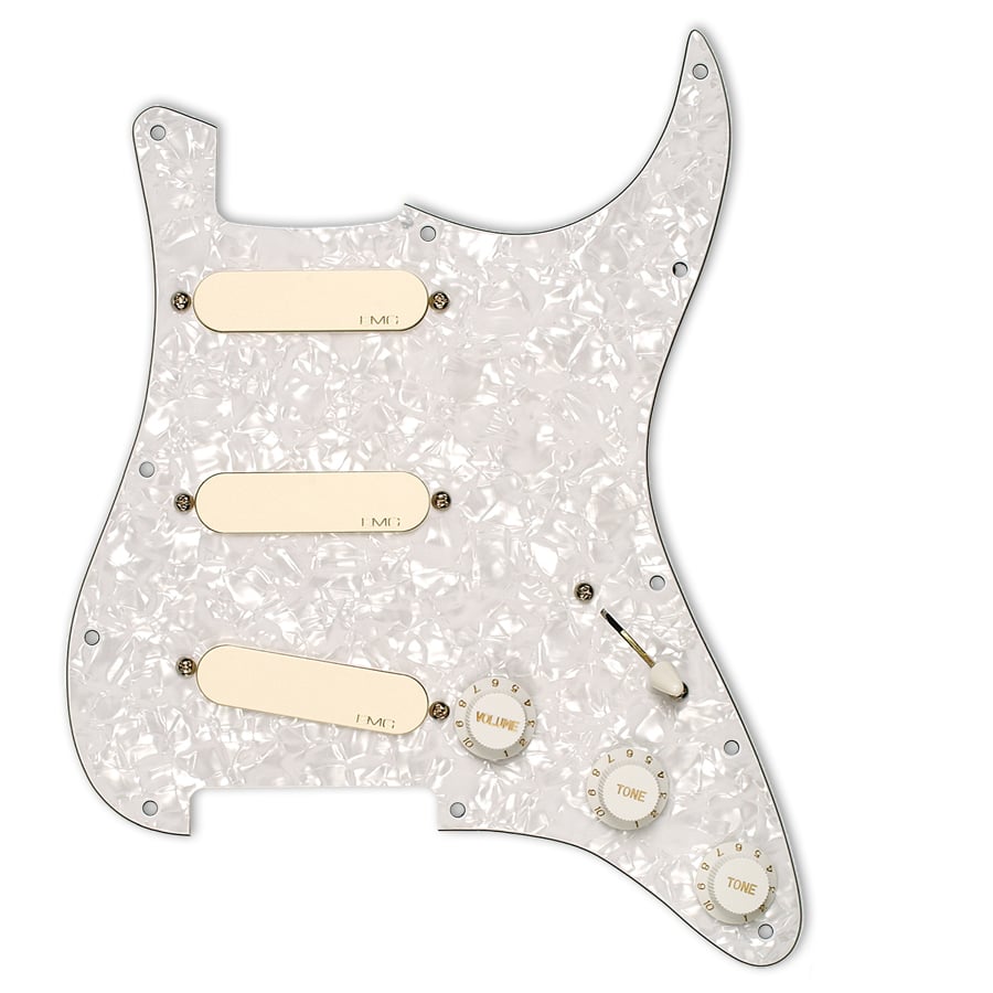 Este conjunto utiliza las capturas de bobina simple SA cargadas con Alnico de EMG en color marfil, un expansor de guitarra EXG para frecuencias de graves y agudos aumentadas, y un control de presencia de SPC para mejorar la tierra y el rango medio de su Strat. El sistema sin soldadura viene precableado en un pickguard de perlas blancas de 11 agujeros personalizado con perillas blancas para una fácil instalación.