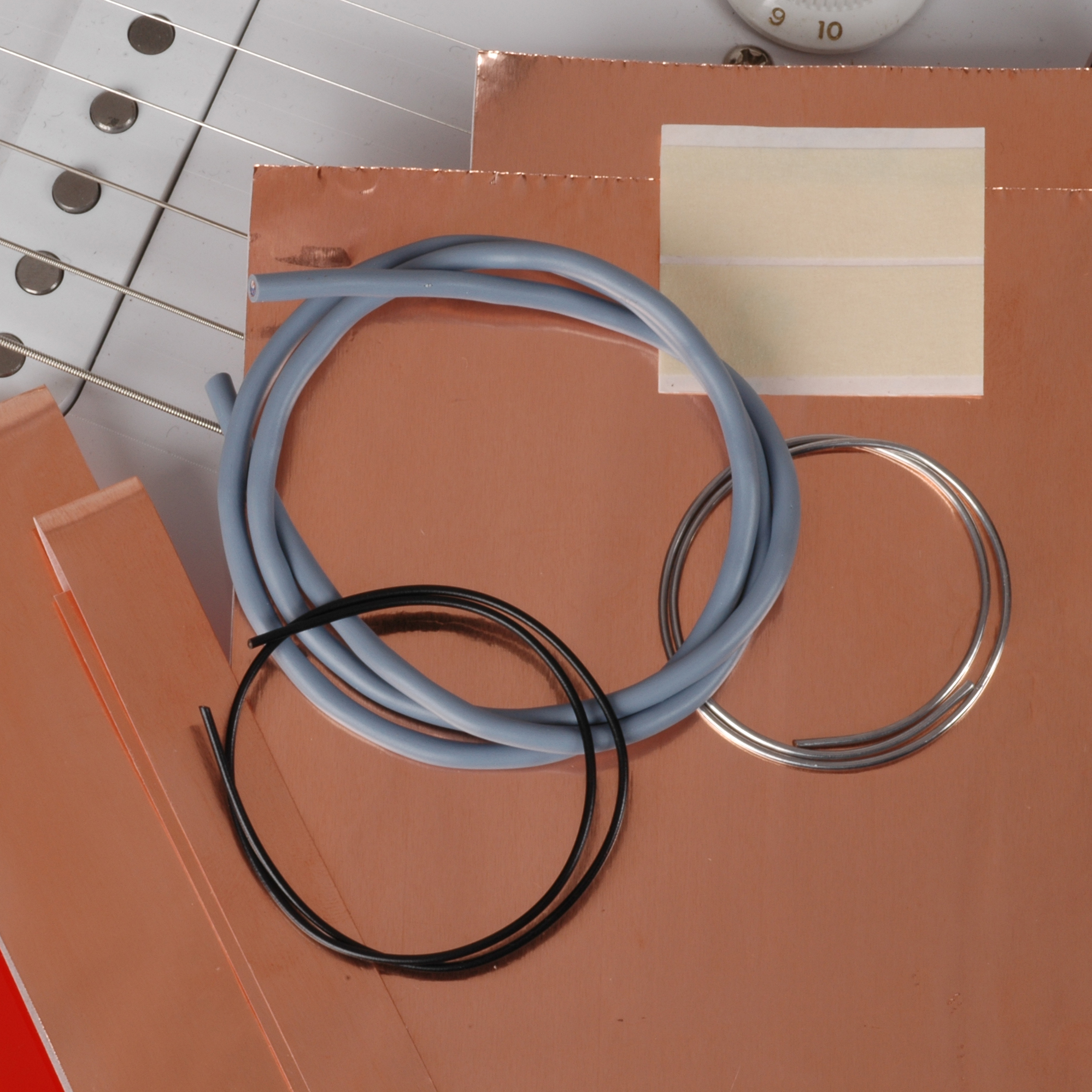 #3790 El kit grande tiene suficiente papel de aluminio para Strats fabricados desde '90s. Incluye: • Lámina de cobre autoadhesiva en tres tamaños: 1-1/8" x 13-1/2" (2 hojas) 1/2" x 19-1/2" y cuatro hojas de 5" x 7" (4 hojas) • 20" de cable blindado de 2 conductores • 5" de cable aislado de un solo conductor • Soldador • Instrucciones |