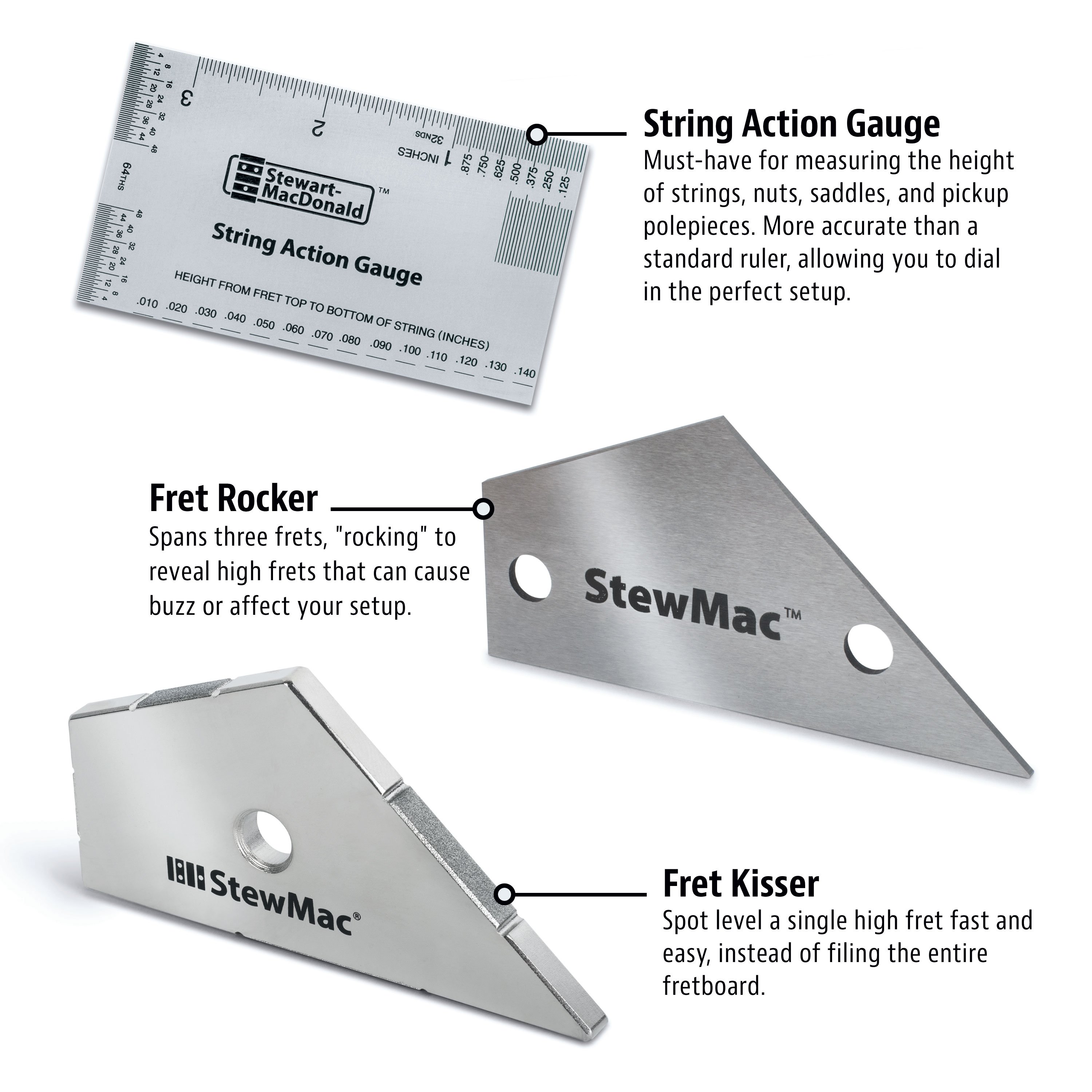 Diseñadas para ofrecer precisión y durabilidad, cada herramienta de este kit está entre las favoritas de luthiers y técnicos de reparación. Independientemente de que estés haciendo trabajo de manteniendo en una guitarra desgastada por el uso o ajustando un instrumento en tu taller, el trío de herramientas de precisión para trastes te dará la confianza de hacer el trabajo siempre bien.