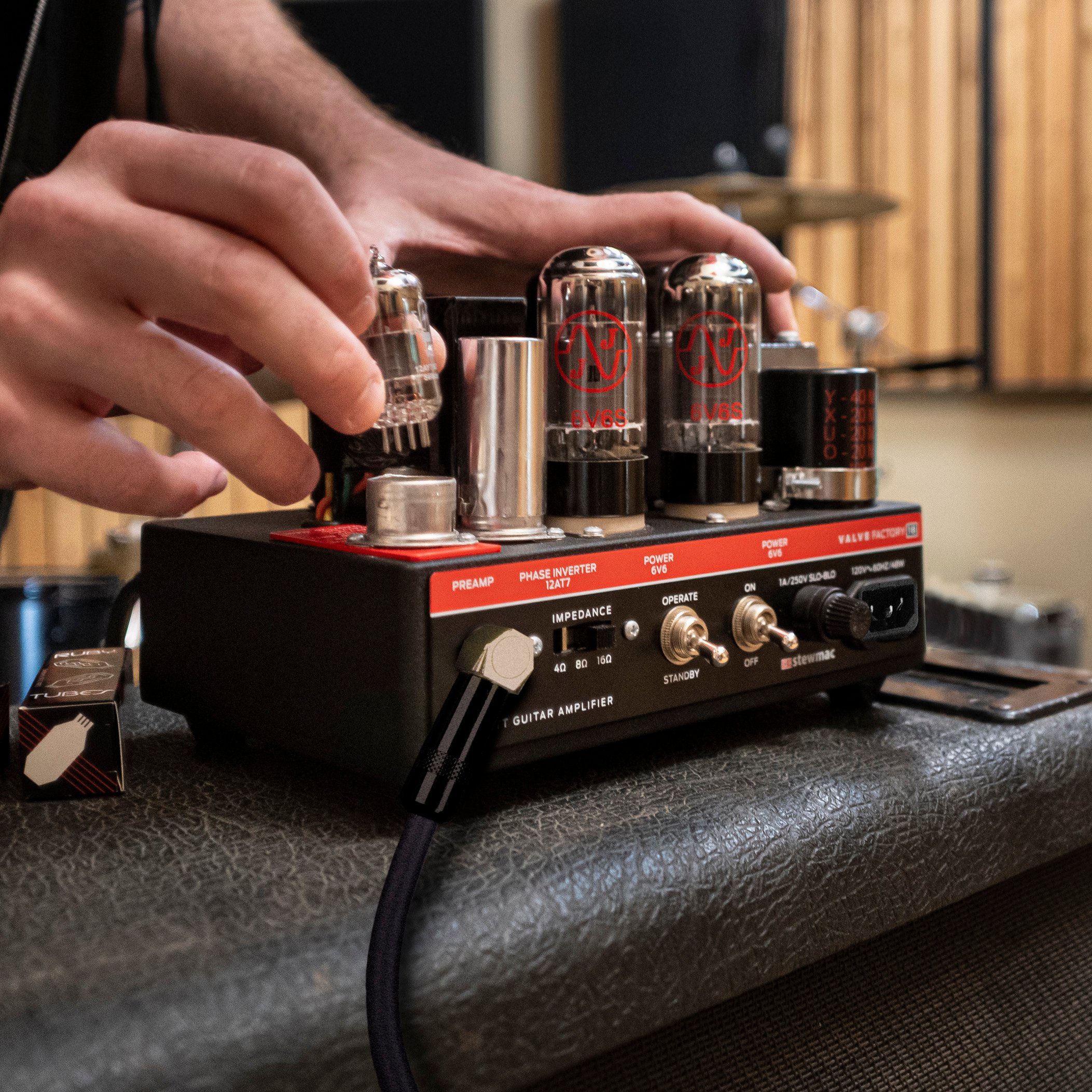- Dos tubos de preamplificador para iniciar tu aventura de búsqueda de tonos: un 12AX7 para la arena de rock clásica y un 12AY7 para limpiezas suaves y con jazz.