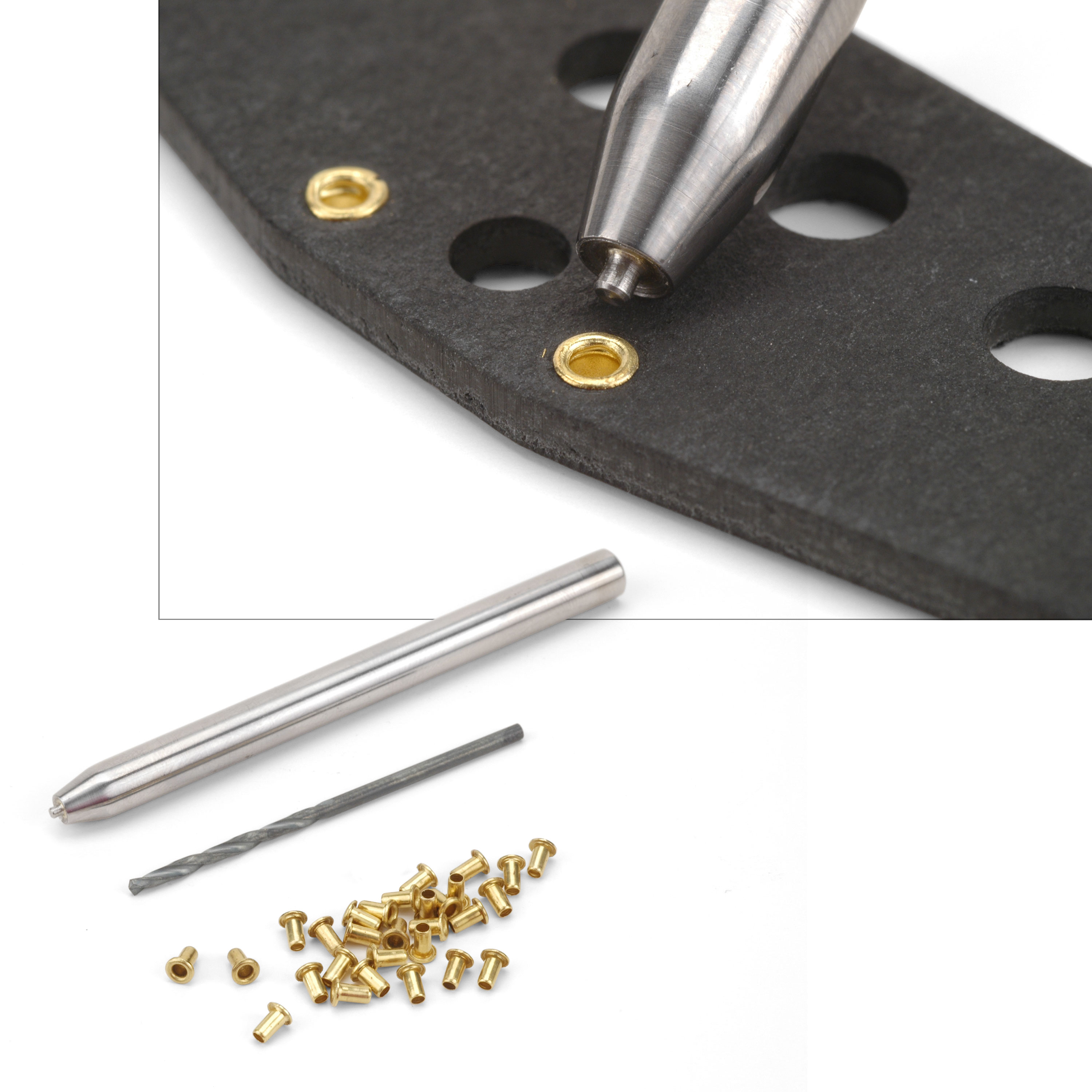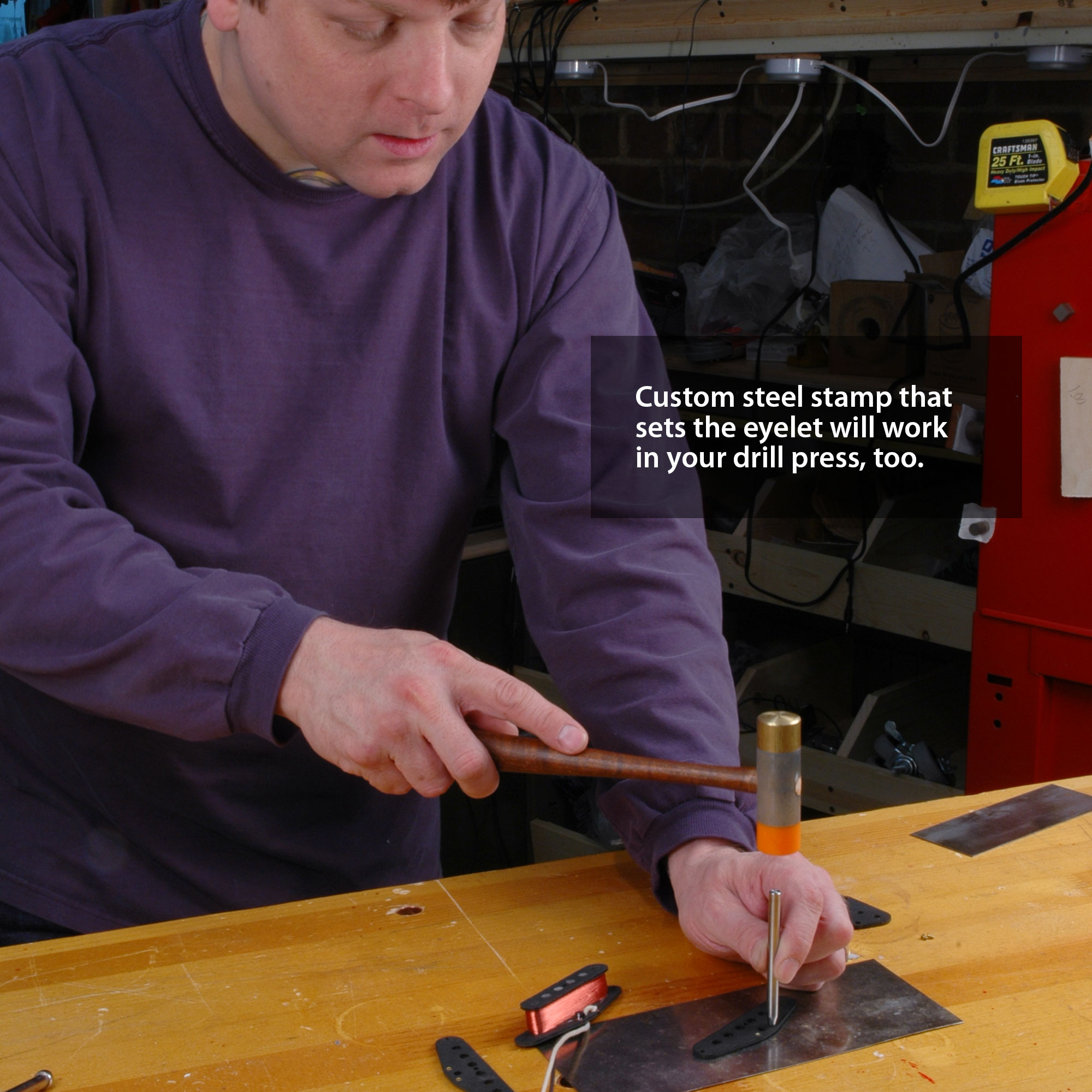 El juego incluye una broca de acero de 0,073" (1,85 mm) de diámetro para taladrar orificios de montaje del tamaño correcto, además de nuestro sello de acero personalizado que asegura el ojal y enrolla su brida. Herramientas esenciales para un cableado de pastilla sin problemas.