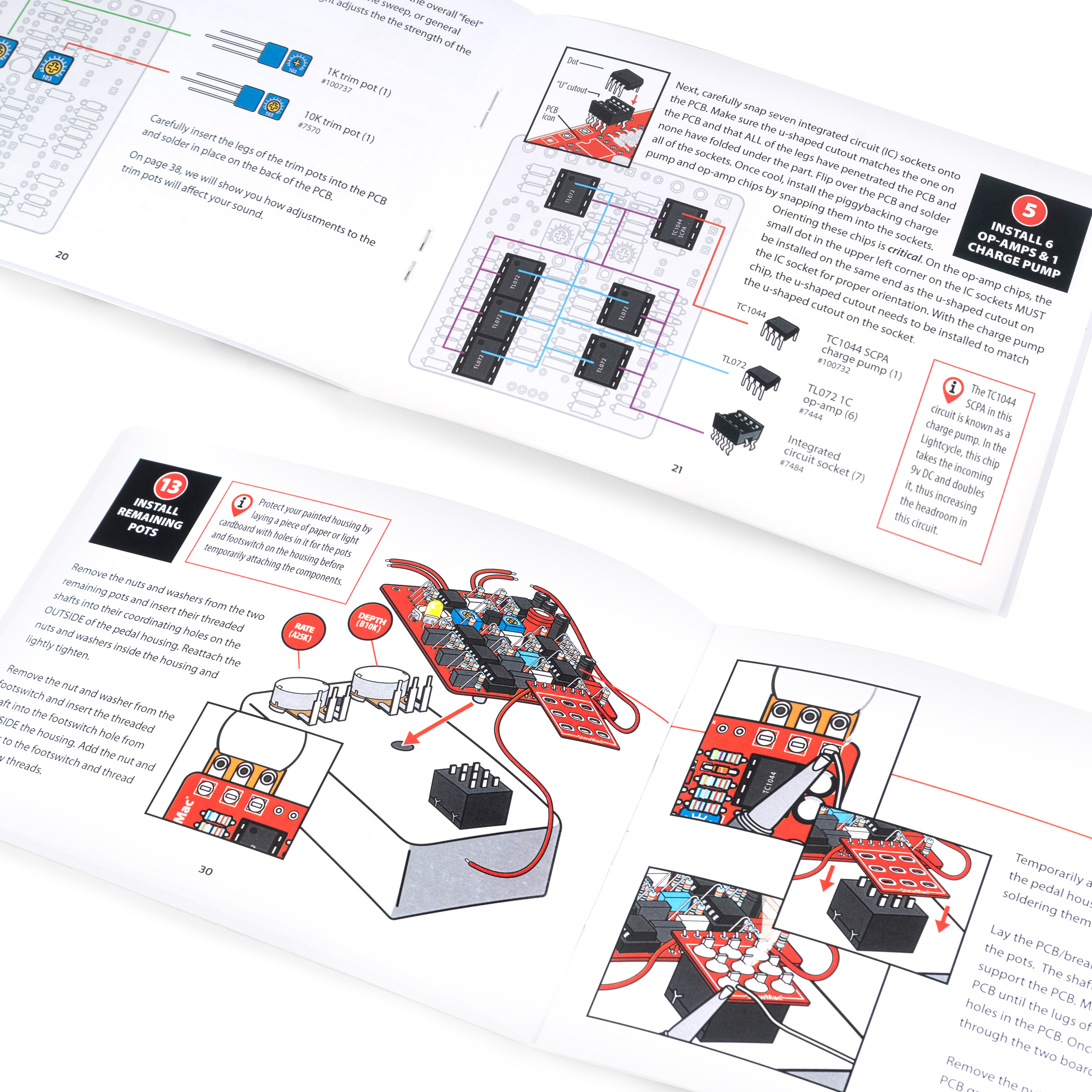 Este es un proyecto divertido en el que aprenderás mucho y obtendrás un pedal de sonido increíble. Las instrucciones detalladas muestran cada junta de soldadura y valor de resistencia para que su construcción sea perfecta de principio a fin. Esta puede ser una construcción desafiante: si te atascas, nuestro equipo está aquí para ayudarte. Será un orgullo cada vez que pises el pedal personalizado que tú construiste.