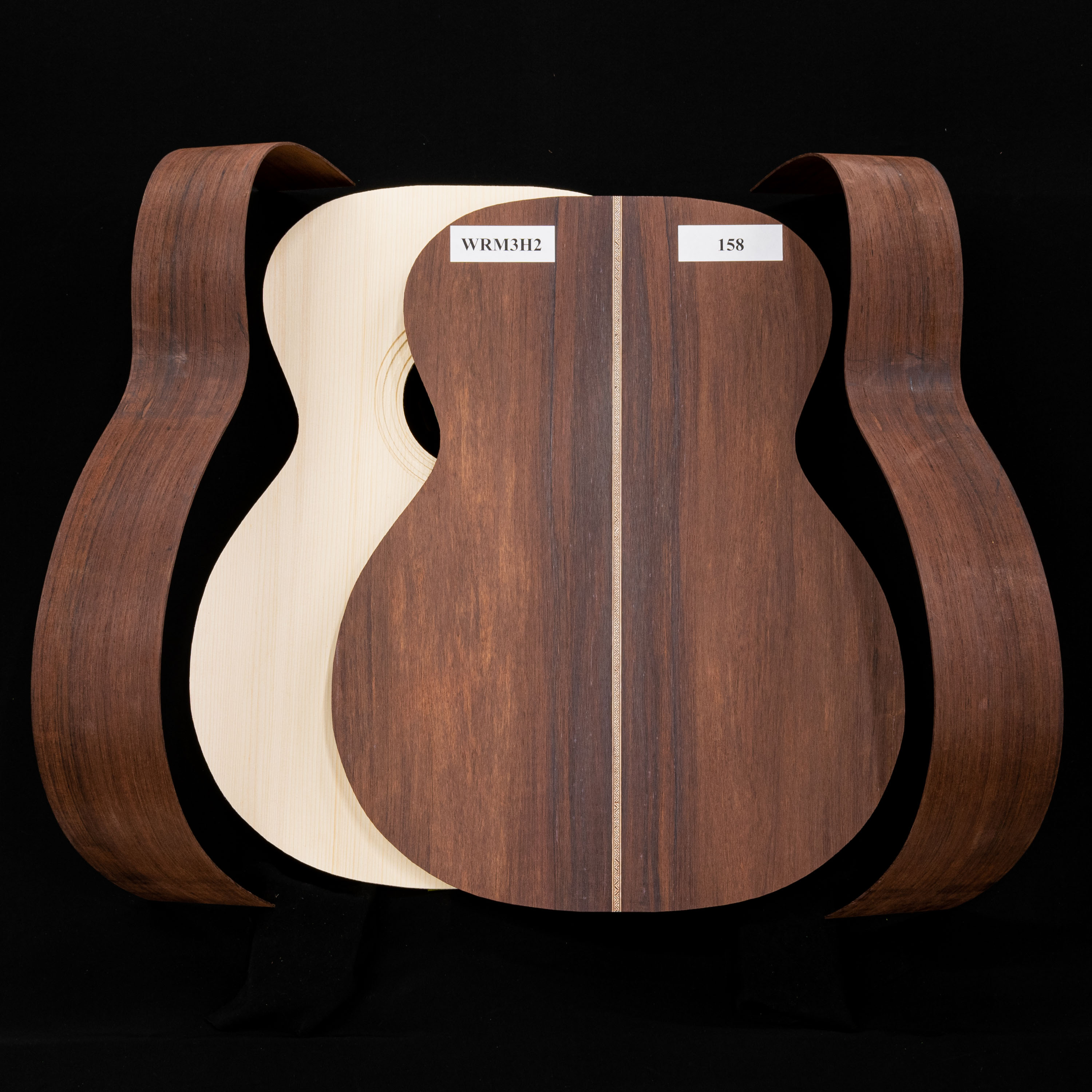 Afrontémoslo, las maderas son la base de estas grandes guitarras, y sabíamos que teníamos que mantenerlas tan fieles al original como fuera posible. El palisandro brasileño, que se utilizó en la parte posterior y en los laterales de los originales, ya no está disponible comercialmente, por lo que seleccionamos a mano el palisandro Madagascar de grado 5A más alto (Dalbergia baronii) del mercado. Esta especie de palisandro tiene (y suena) el mismo aspecto que la realidad. Luego lo combinamos con el Adirondack Red Spruce (Picea rubens) más ligero y rígido de nuestra reserva, como lo hicieron en Nazaret en la década de 1930. Por último, hemos seleccionado a mano los portapapeles y puentes de ébano más negros para estos kits. Dado que es ilegal utilizar el marfil del elefante, utilizamos nuestro hueso más fino para la cejuela y la silleta.