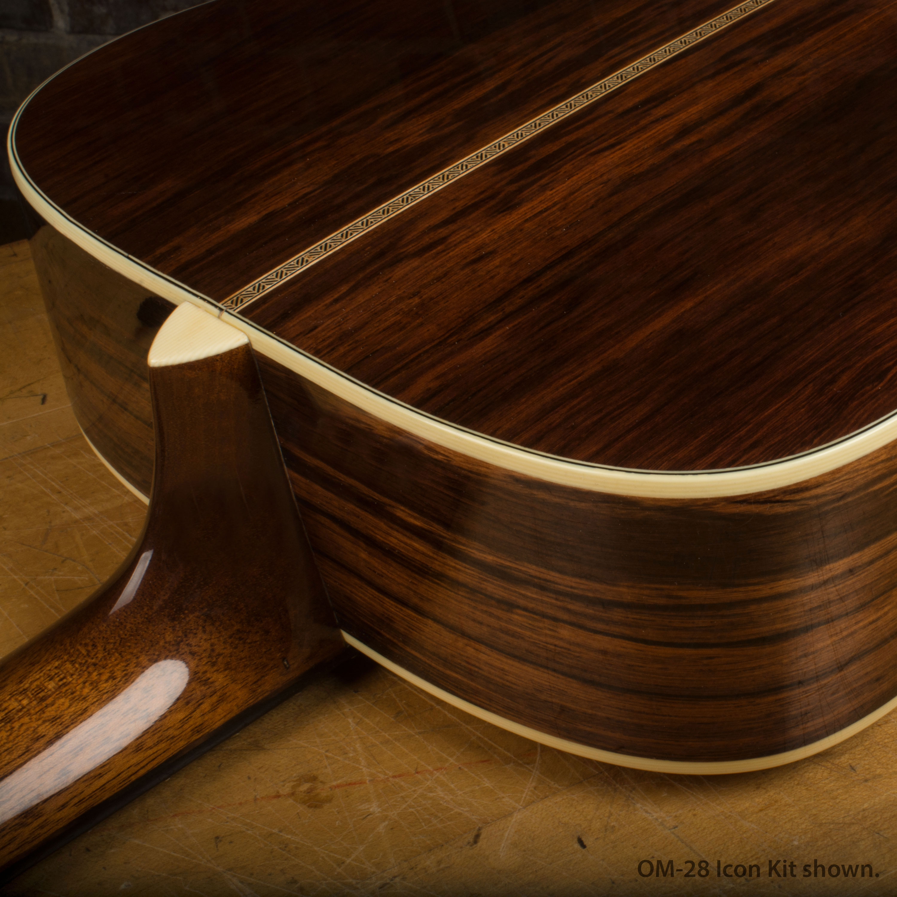 Afrontémoslo, las maderas son la base de estas grandes guitarras, y sabíamos que teníamos que mantenerlas tan fieles al original como fuera posible. El palisandro brasileño, que se utilizó en la parte posterior y en los laterales de los originales, ya no está disponible comercialmente, por lo que seleccionamos a mano el palisandro Madagascar de grado 5A más alto (Dalbergia baronii) del mercado. Esta especie de palisandro tiene (y suena) el mismo aspecto que la realidad. Luego lo combinamos con el Adirondack Red Spruce (Picea rubens) más ligero y rígido de nuestra reserva, como lo hicieron en Nazaret en la década de 1930. Por último, hemos seleccionado a mano los portapapeles y puentes de ébano más negros para estos kits. Dado que es ilegal utilizar el marfil del elefante, utilizamos nuestro hueso más fino para la cejuela y la silleta.