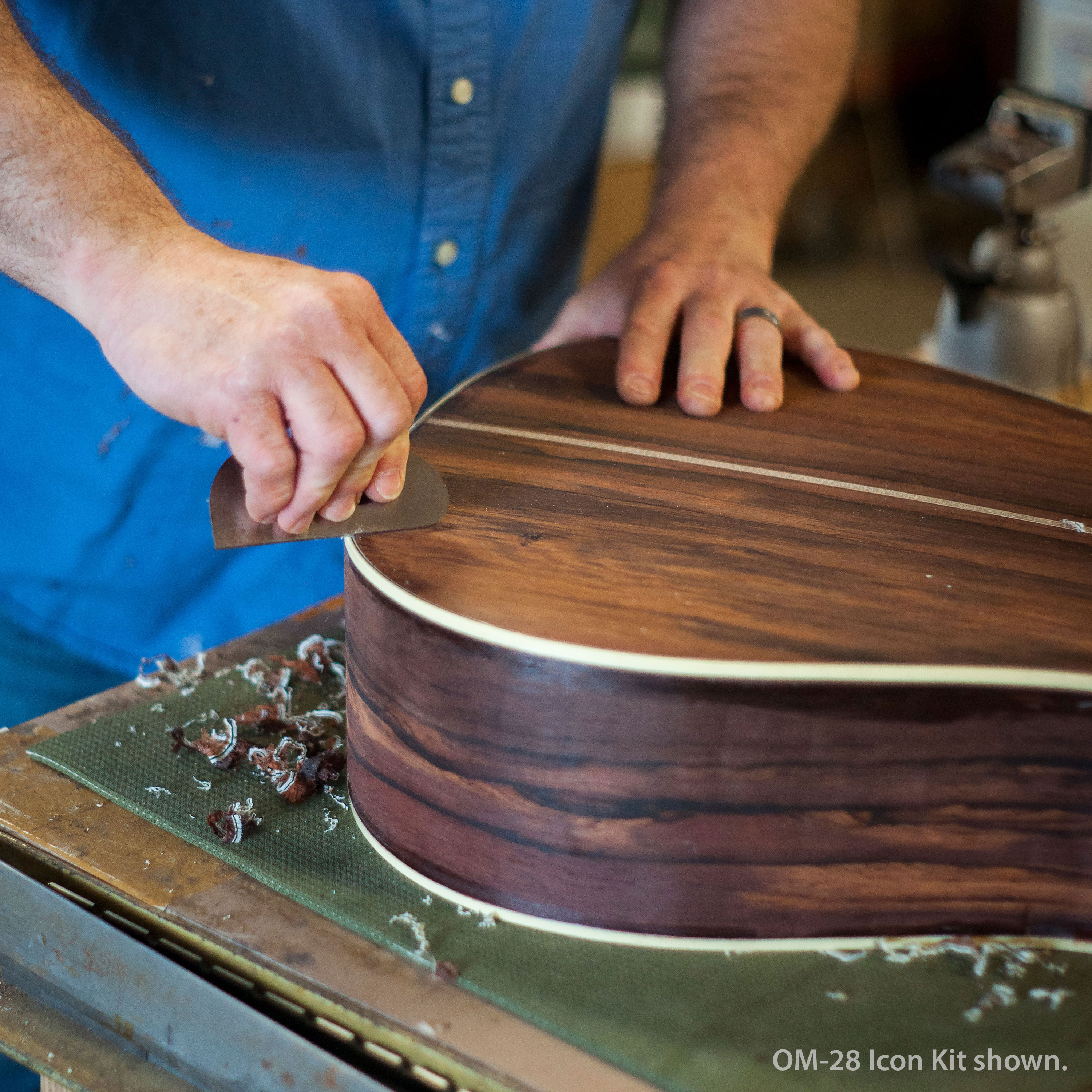 Afrontémoslo, las maderas son la base de estas grandes guitarras, y sabíamos que teníamos que mantenerlas tan fieles al original como fuera posible. El palisandro brasileño, que se utilizó en la parte posterior y en los laterales de los originales, ya no está disponible comercialmente, por lo que seleccionamos a mano el palisandro Madagascar de grado 5A más alto (Dalbergia baronii) del mercado. Esta especie de palisandro tiene (y suena) el mismo aspecto que la realidad. Luego lo combinamos con el Adirondack Red Spruce (Picea rubens) más ligero y rígido de nuestra reserva, como lo hicieron en Nazaret en la década de 1930. Por último, hemos seleccionado a mano los portapapeles y puentes de ébano más negros para estos kits. Dado que es ilegal utilizar el marfil del elefante, utilizamos nuestro hueso más fino para la cejuela y la silleta.