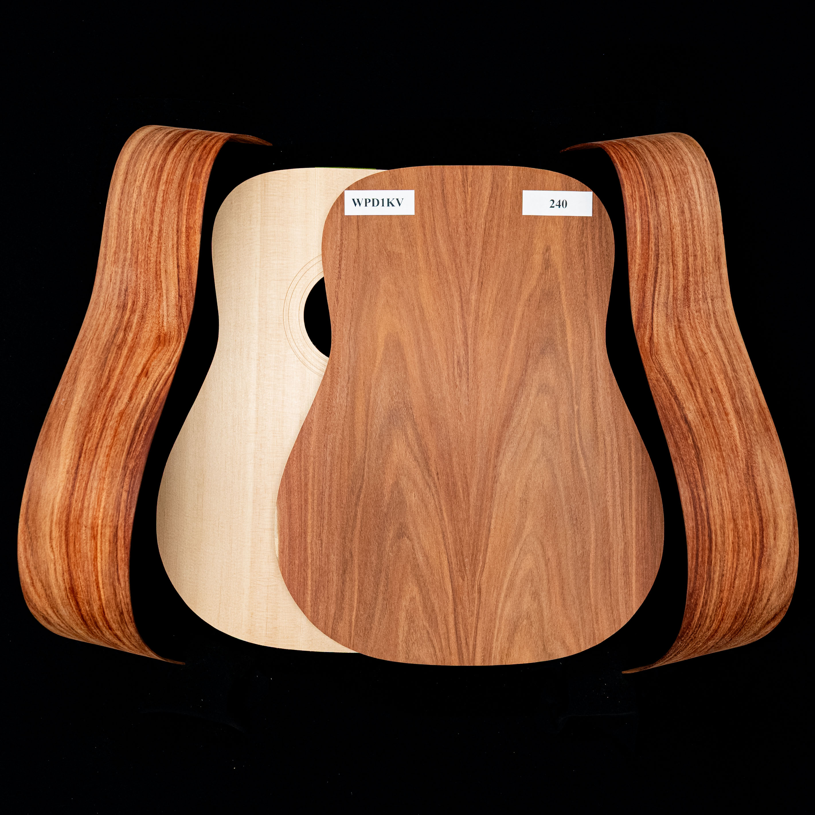 Para este temible kit, hemos combinado los preciosos tops AAA Granadillo (Platymiscium yucutannum) en la parte posterior y set de aros con nuestros tops más ligeros y rígidos AAA Sitka Spruce (Picea sitchensis) para crear una guitarra personalizada impresionante. Esta combinación de madera es una guitarra poderosa, dinámica e increíblemente rica en todo el espectro tonal.