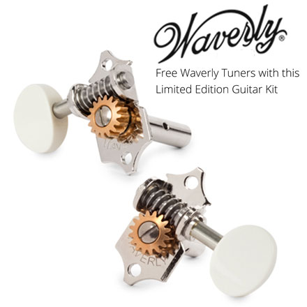 Las maderas de estos kits son realmente impresionantes y hermosas. Por eso hemos decidido incluir un juego GRATIS de Waverly Tuning Machines. Este kit viene con nuestros sintonizadores de níquel pulido con perillas blancas que le darán un aspecto excelente con la binding blanca, la cejuela y la silleta óseas y los pasadores blancos del puente.