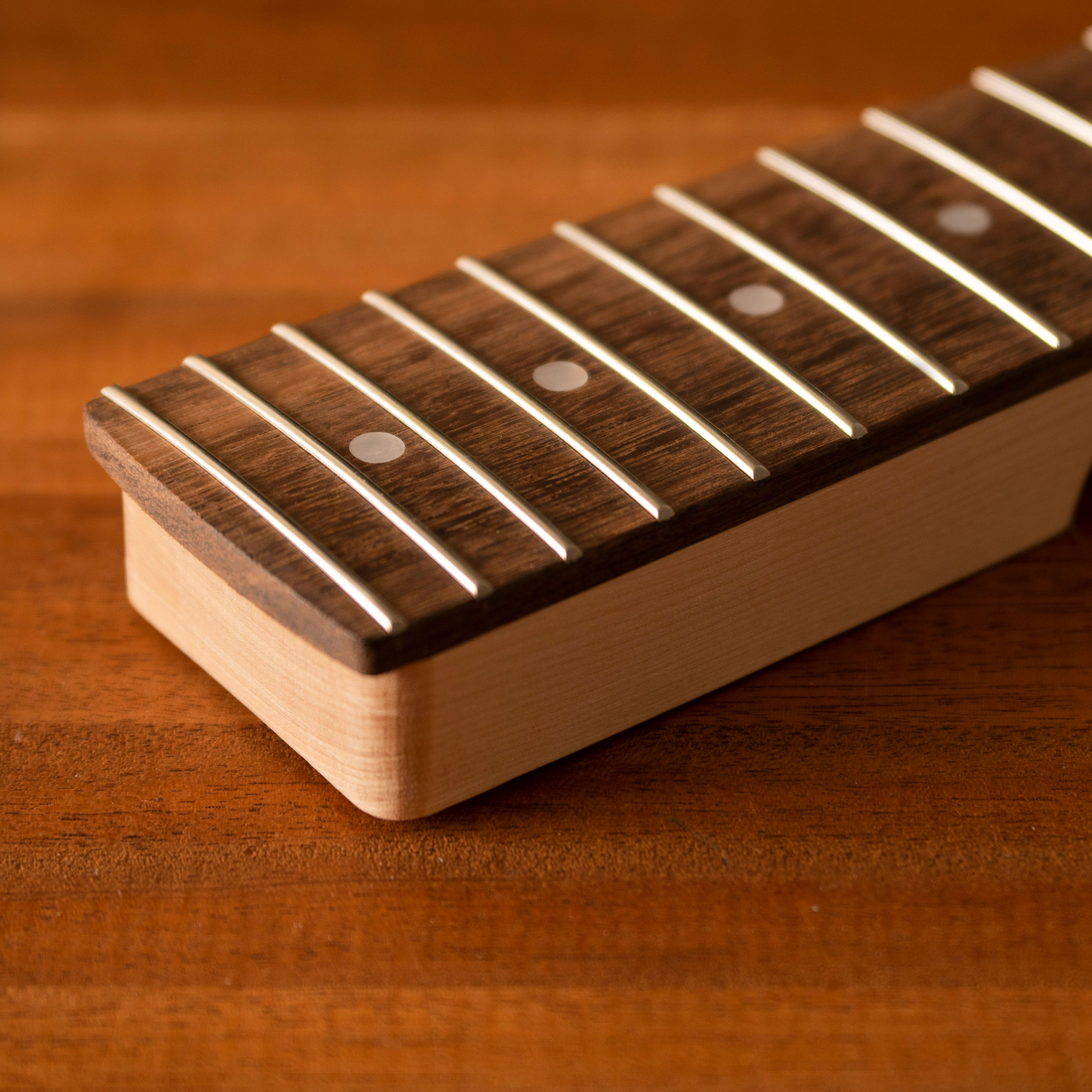 - diapasón Indian Laurel con trastes preinstalados e incrustaciones de puntos