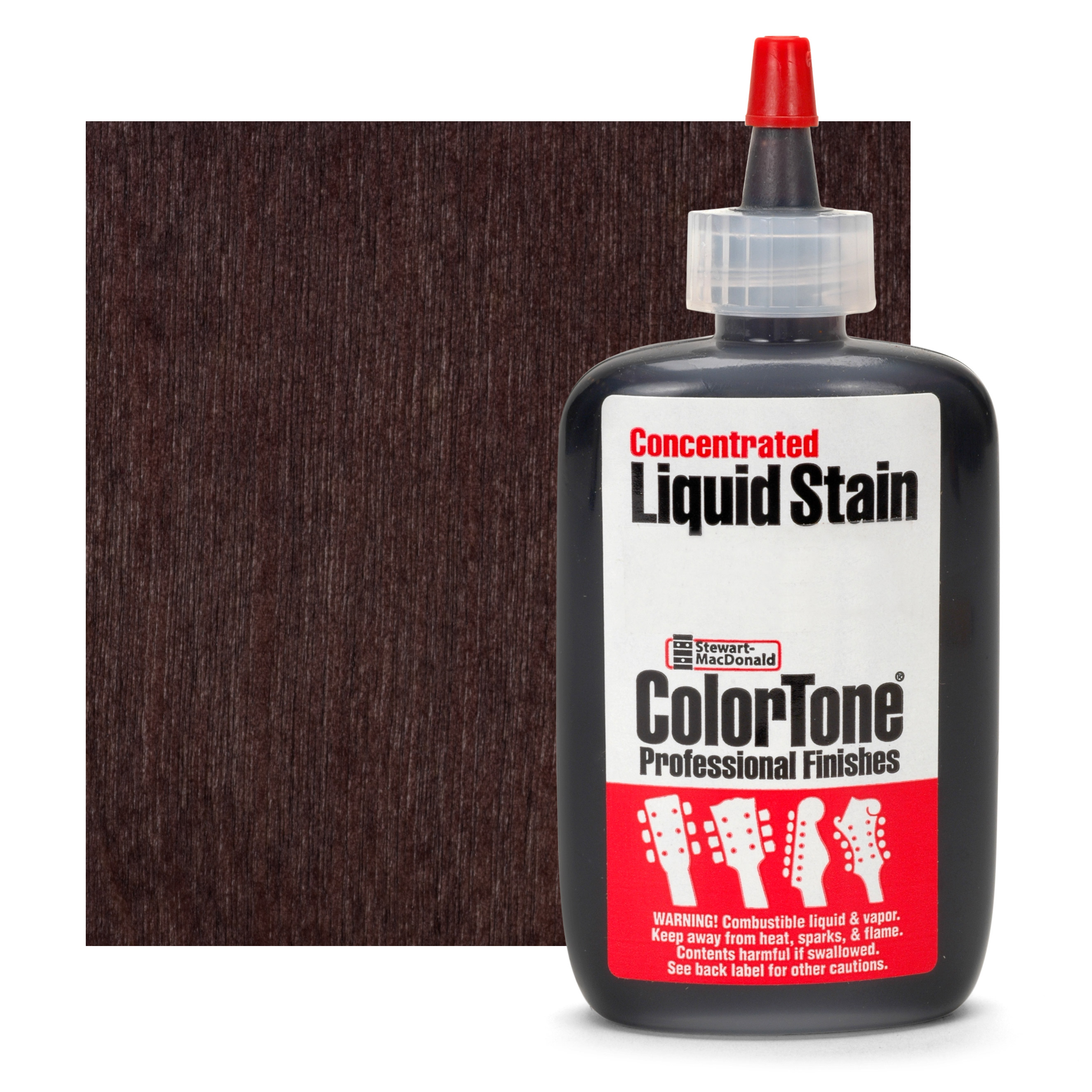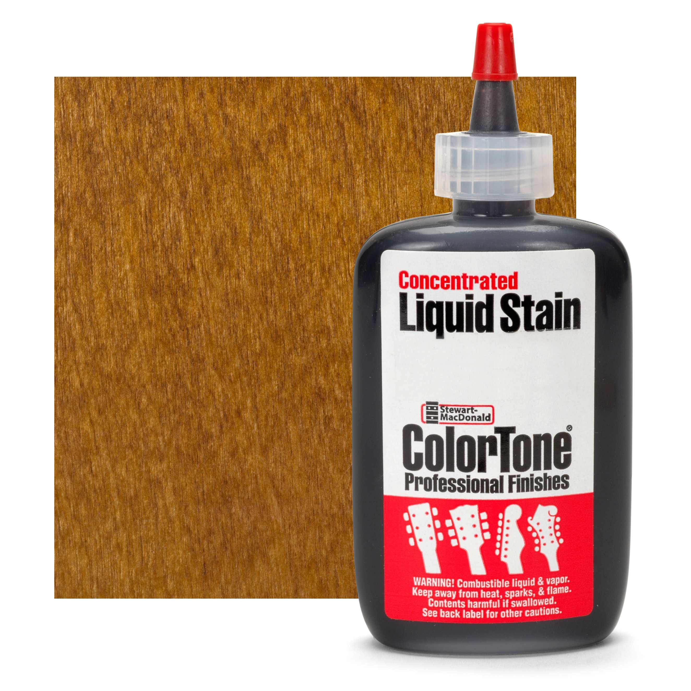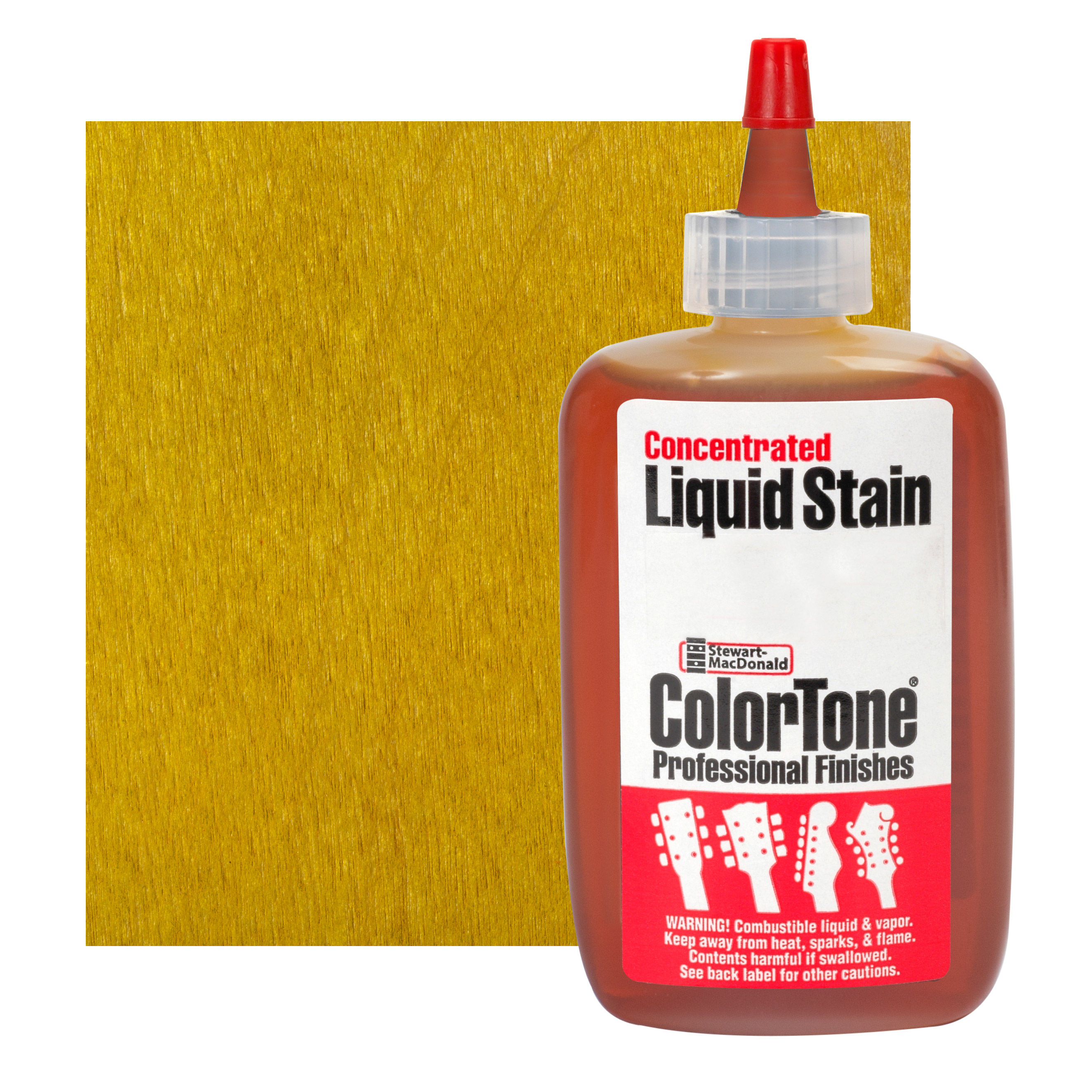Las manchas líquidas ColorTone son tintes complejos de metal ligeros que se pueden mezclar para prácticamente cualquier intensidad deseada. A diferencia de los tintes genéricos que puedas encontrar en una ferretería, están formulados específicamente para acabados de guitarra. Una botella de 2 onzas rinde hasta 2 cuartos de galón de tinte a concentración normal. Al ser líquidos, pueden medirse con precisión para lograr coincidencias exactas de color, lo que es una gran ventaja para hacer retoques o restauraciones. (Echa un vistazo a nuestras prácticas tazas medidoras y pipetas para mezclar tintes).
