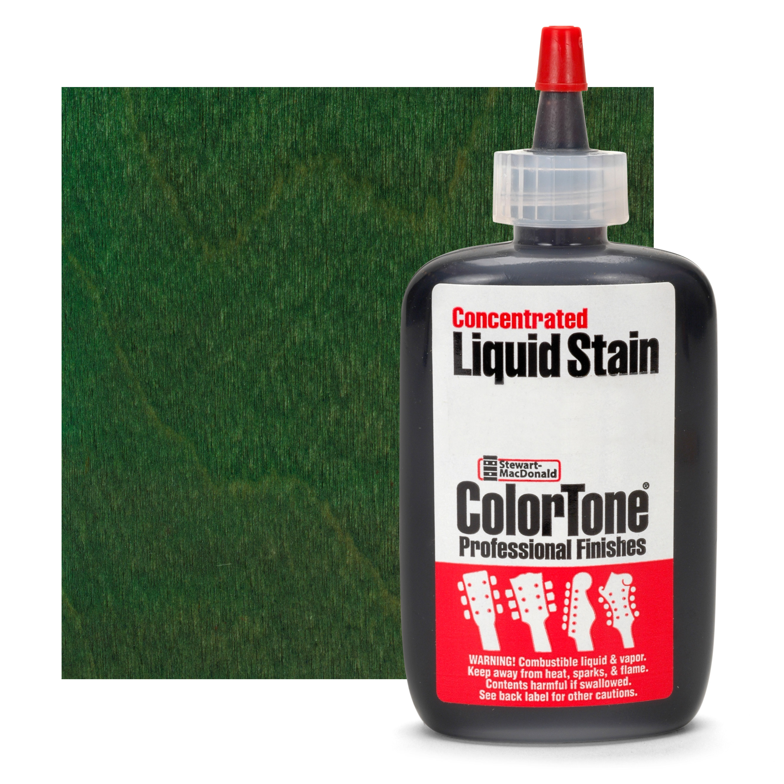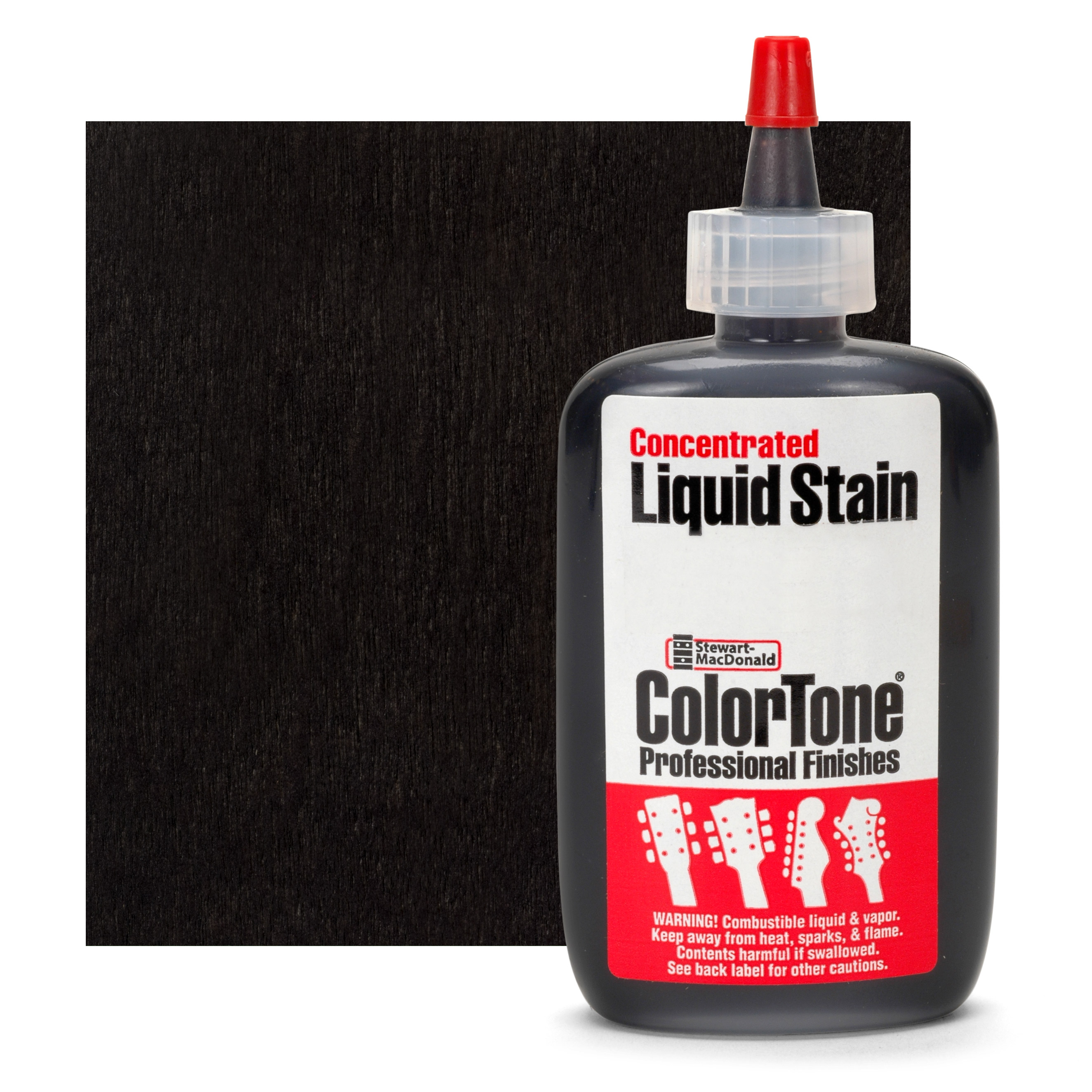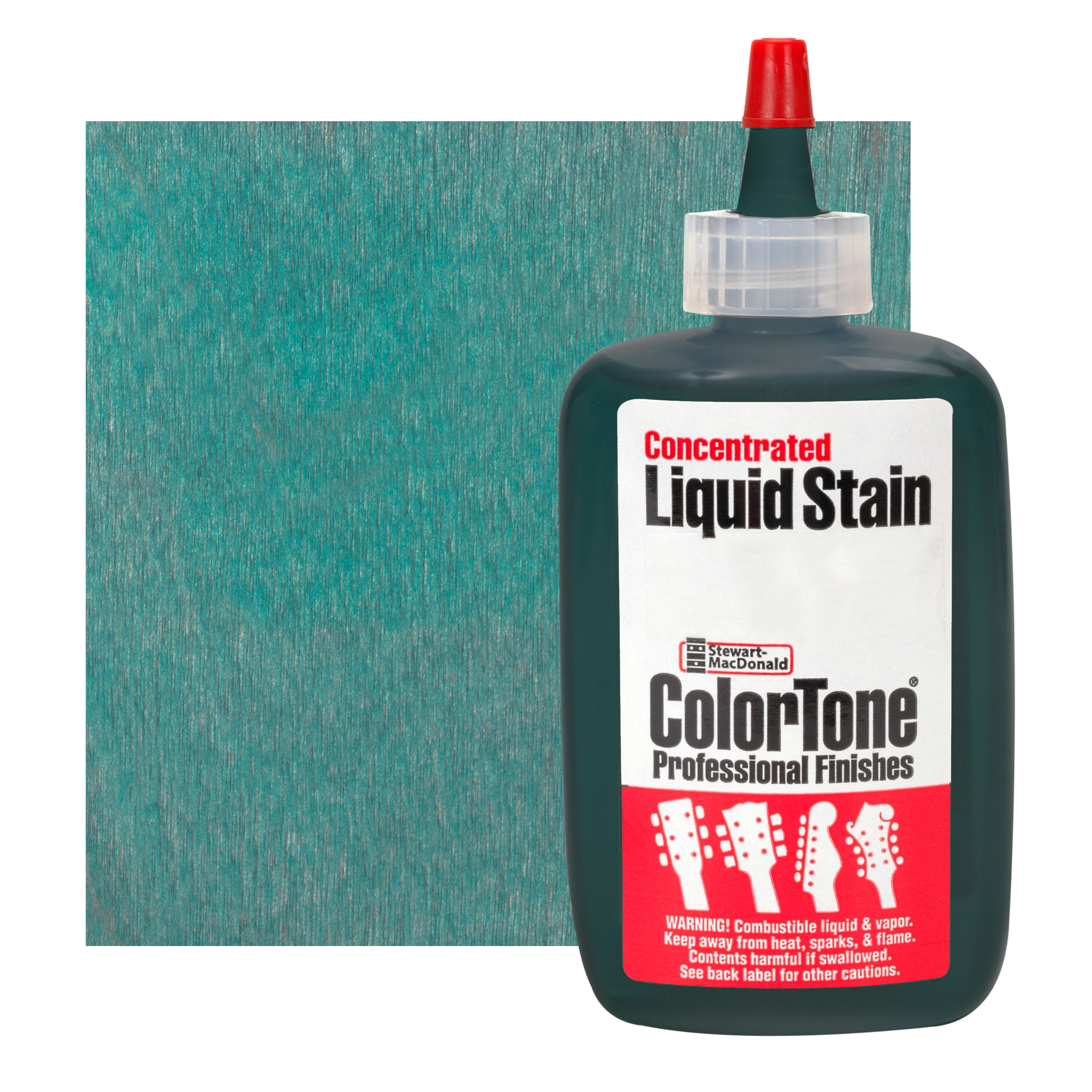 Las manchas líquidas ColorTone son tintes complejos de metal ligeros que se pueden mezclar para prácticamente cualquier intensidad deseada. A diferencia de los tintes genéricos que puedas encontrar en una ferretería, están formulados específicamente para acabados de guitarra. Una botella de 2 onzas rinde hasta 2 cuartos de galón de tinte a concentración normal. Al ser líquidos, pueden medirse con precisión para lograr coincidencias exactas de color, lo que es una gran ventaja para hacer retoques o restauraciones. (Echa un vistazo a nuestras prácticas tazas medidoras y pipetas para mezclar tintes).