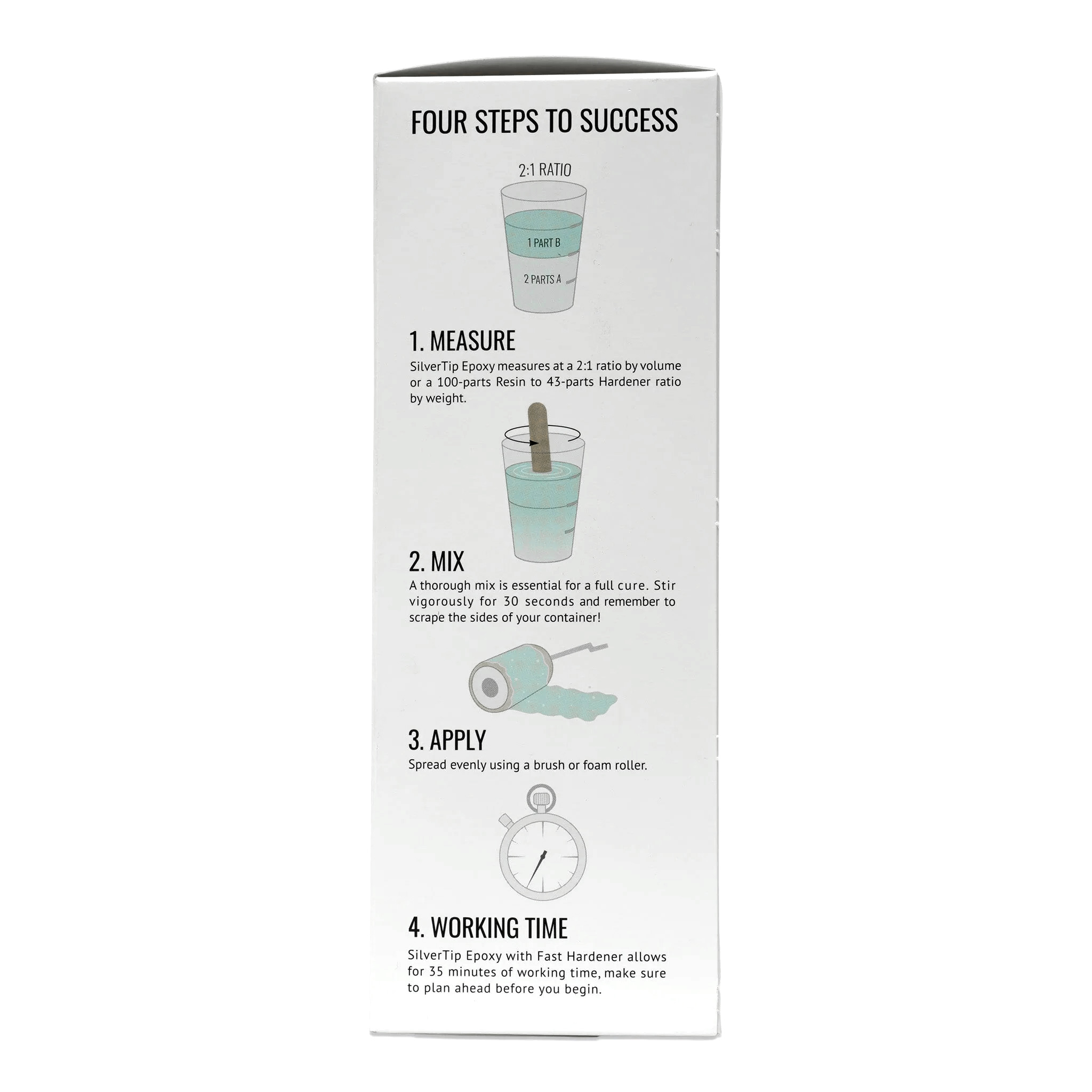 SilverTip no se encoge al secarse, lo que ve es lo que obtiene. Se aplica igual que los rellenos tradicionales: solo tienes que mezclar, aplicar y raspar el exceso. Es un epoxi de curado rápido que tiene 35 minutos de tiempo de trabajo, está listo para volver a aplicar el recubrimiento en 3 horas.