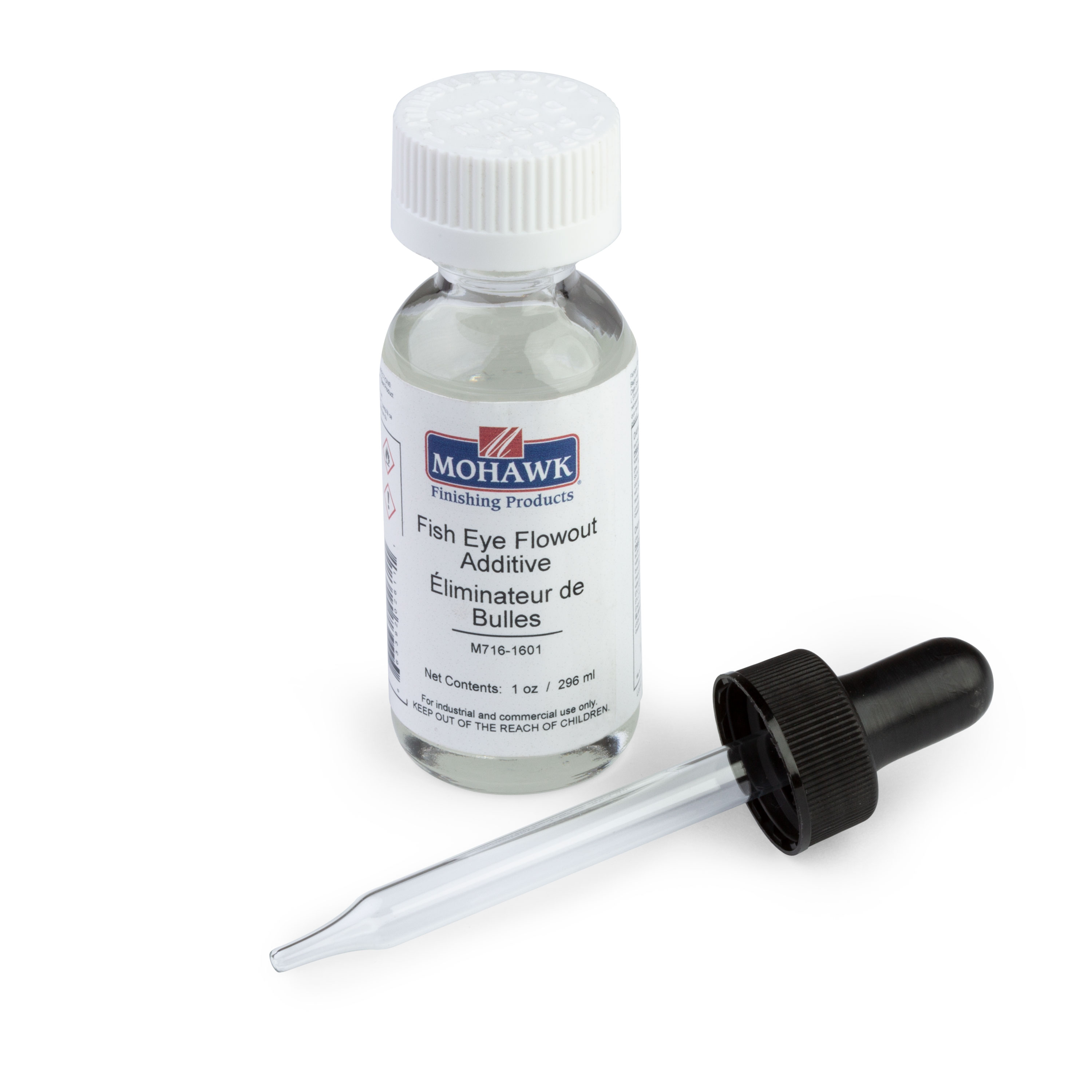 Cuando aparezcan ojos de pez (cráteres causados por residuos de pulidos de silicona o aceites en la madera) en las capas de acabado iniciales, añada unas gotas de Fisheye Flowout a la laca antes de volver a pulverizar.