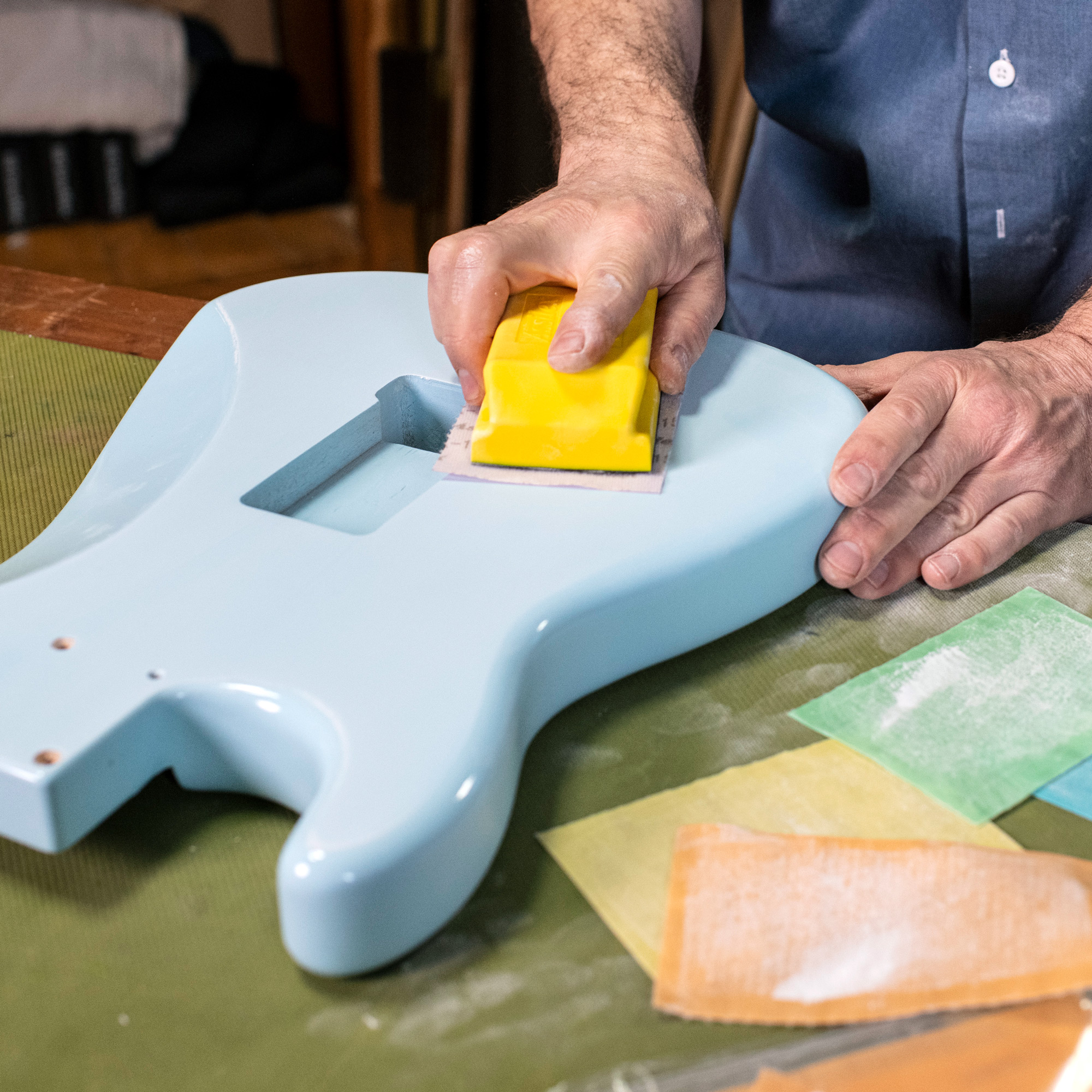 Este sistema revoluciona por completo el acabado de guitarras nuevas. El corte superficial facilita el lijado nivelador entre cada capa de barniz transparente. El lijado es tan uniforme que ya no tendrás que buscar rayones profundos antes de pasar al siguiente grano. Las marcas finas se eliminan rápidamente al pulir las capas superiores.