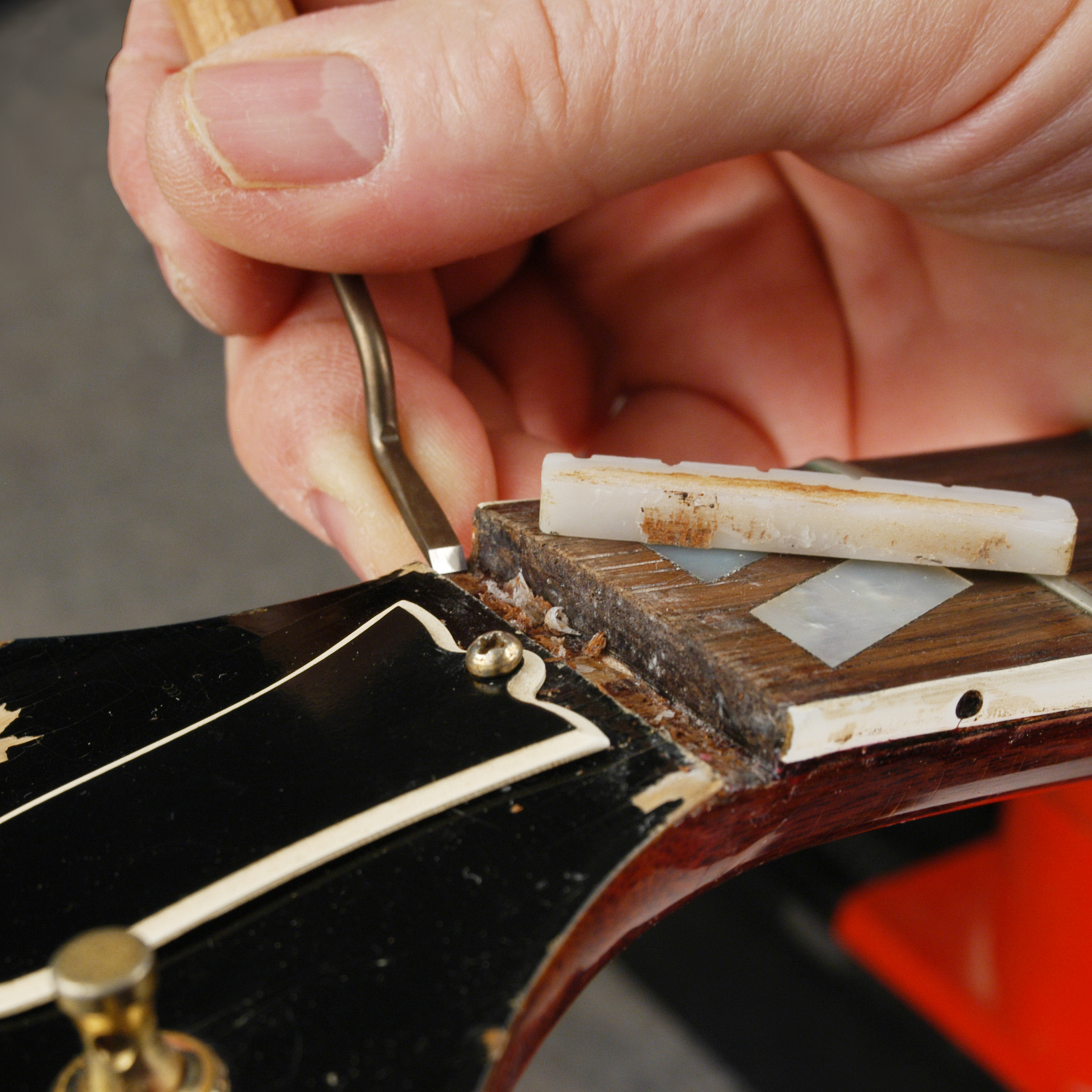 Estos cinceles de 5-1/2" con mango de madera son perfectos para recortar tuercas y ranuras de silleta o para eliminar pegamento seco alrededor de varetas y trastes. El mango y las puntas del formón "perro" permiten un control preciso de la yema del dedo.