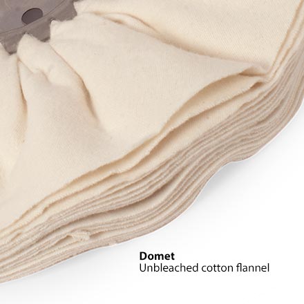 El algodón Domet es el más suave disponible. Utilice franela Domet con compuesto fino para obtener un brillo extraalto. Una configuración de búfer versátil utiliza ruedas Canton en un lado (compuesto medio) y Domet en el otro (compuesto fino).