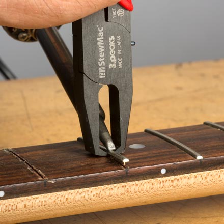 “El afilado extremo se desliza justo debajo de la corona del traste para extraerlo fácilmente”. —Equipo de I+D de StewMac