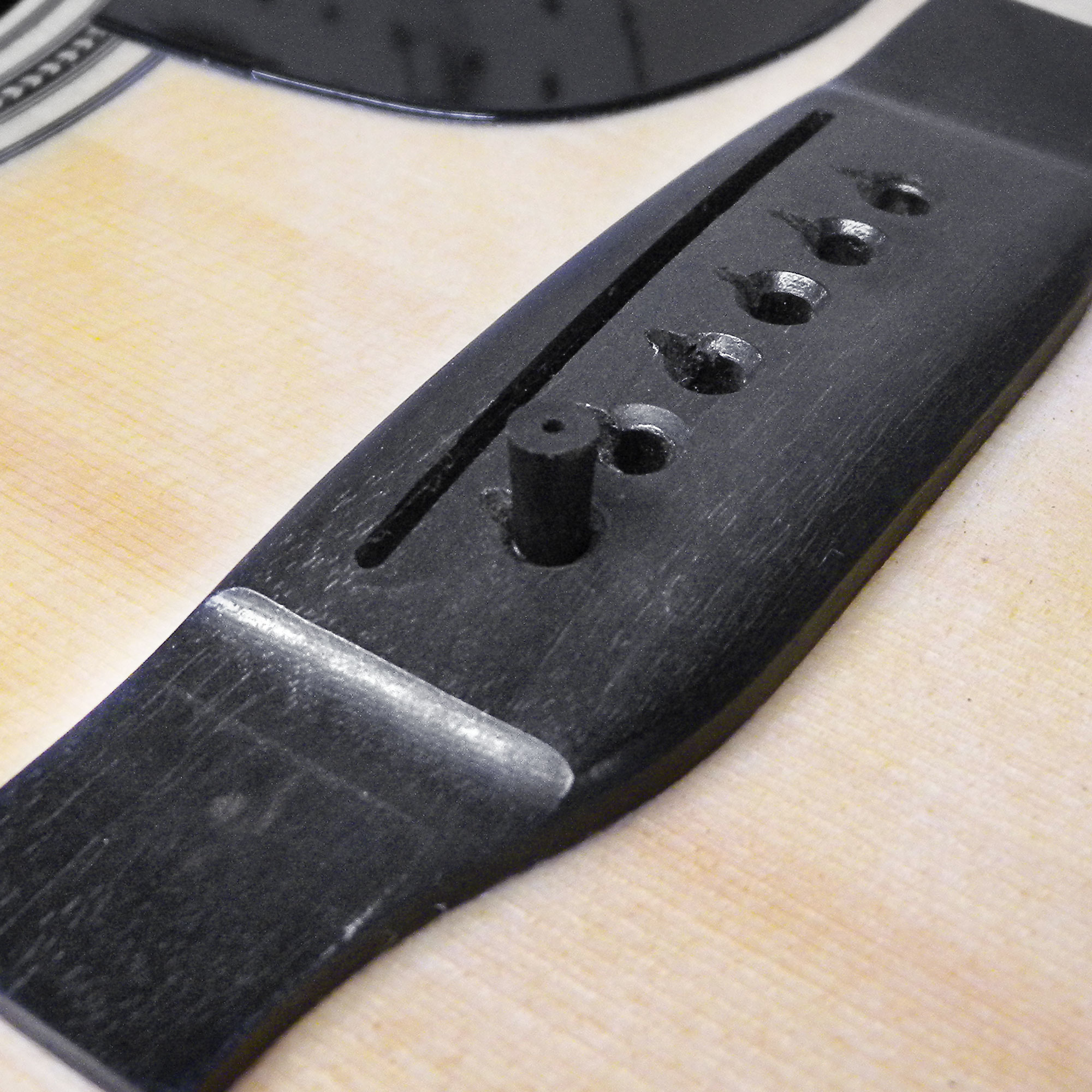Un puente acústico con un orificio de clavija de puente desgastado puede ser difícil de arreglar. Puede escariar el orificio y utilizar un pin puente de gran tamaño, pero esto no tiene un aspecto excelente y no es una opción realista para los instrumentos coleccionables.