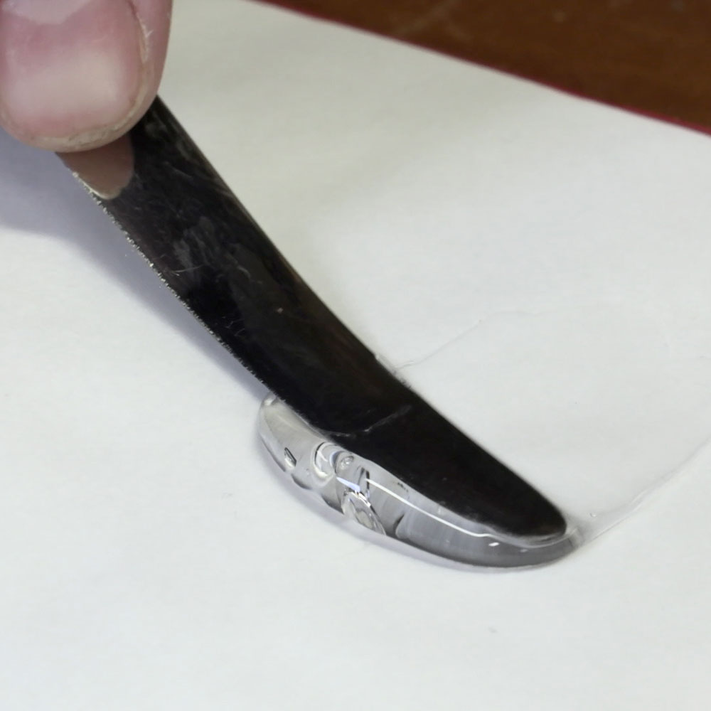 Cuando utilice cuchillos para paletas, caliente primero la zona pegada para ayudar a suavizar la unión. Tenga cuidado de no usar un cuchillo caliente alrededor del acabado.