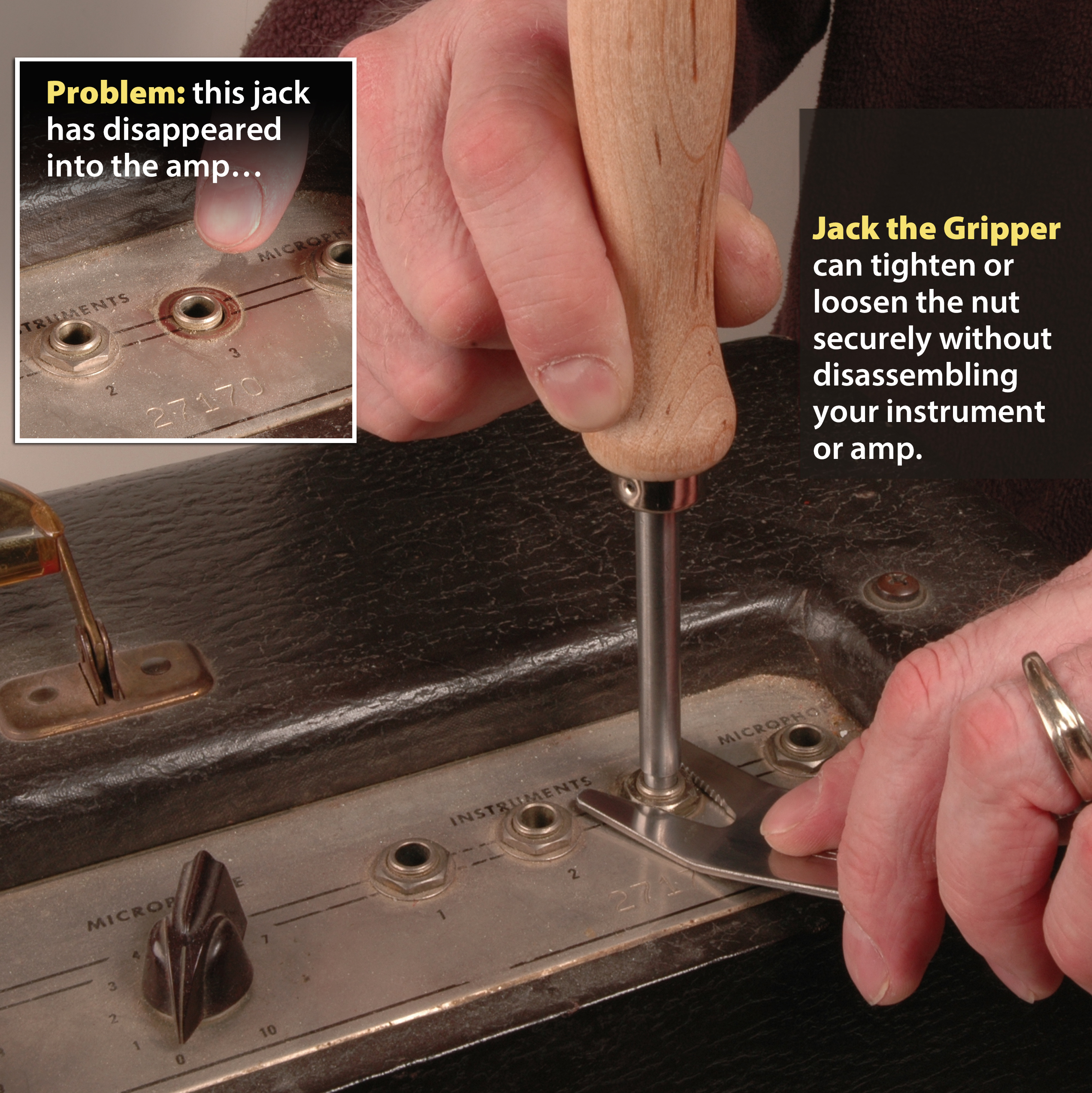 ¡Ingenioso! Sostiene el jack firmemente para que pueda apretar/aflojar la tuerca sin desmontar el instrumento ni el amplificador.