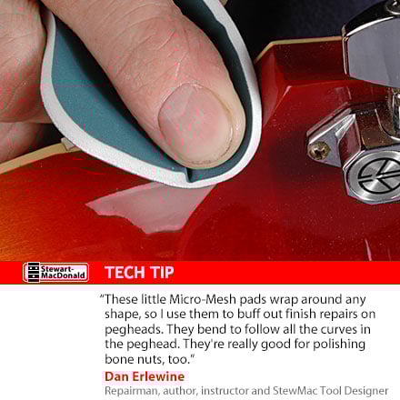 ¿No tiene equipo de pulido doméstico? Estos granos son tan finos que obtendrás un brillo similar al de una fábrica sin un tampón. Y después de un nivel de traste, la Micro-Mesh es nuestro abrasivo favorito para hacer que las trastes sean suaves como la cremoso y brillen como los espejos. Los papeles con reverso de tela y el núcleo de espuma le brindan control y durabilidad que no tiene con otros abrasivos.