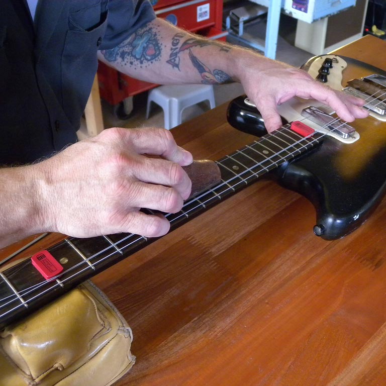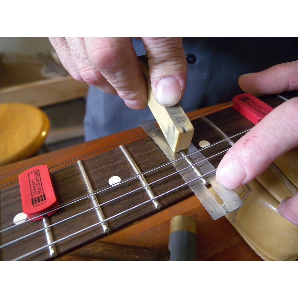 "Necesité algo rápido y fácil, para hacer cualquier cosa, desde limpiar un fretboard hasta trabajar en un zumbido de fret, o pegar un fret suelto, sin quitar las cuerdas. Puedo trabajar en un punto problemático y seguir comprobando que el mástil está funcionando bien, sin devanar la tensión de las cuerdas y volver a ponerlo. Eso ahorra mucho tiempo y energía. Muchas gracias a StewMac por hacer esta pequeña herramienta de ahorro de tiempo”.