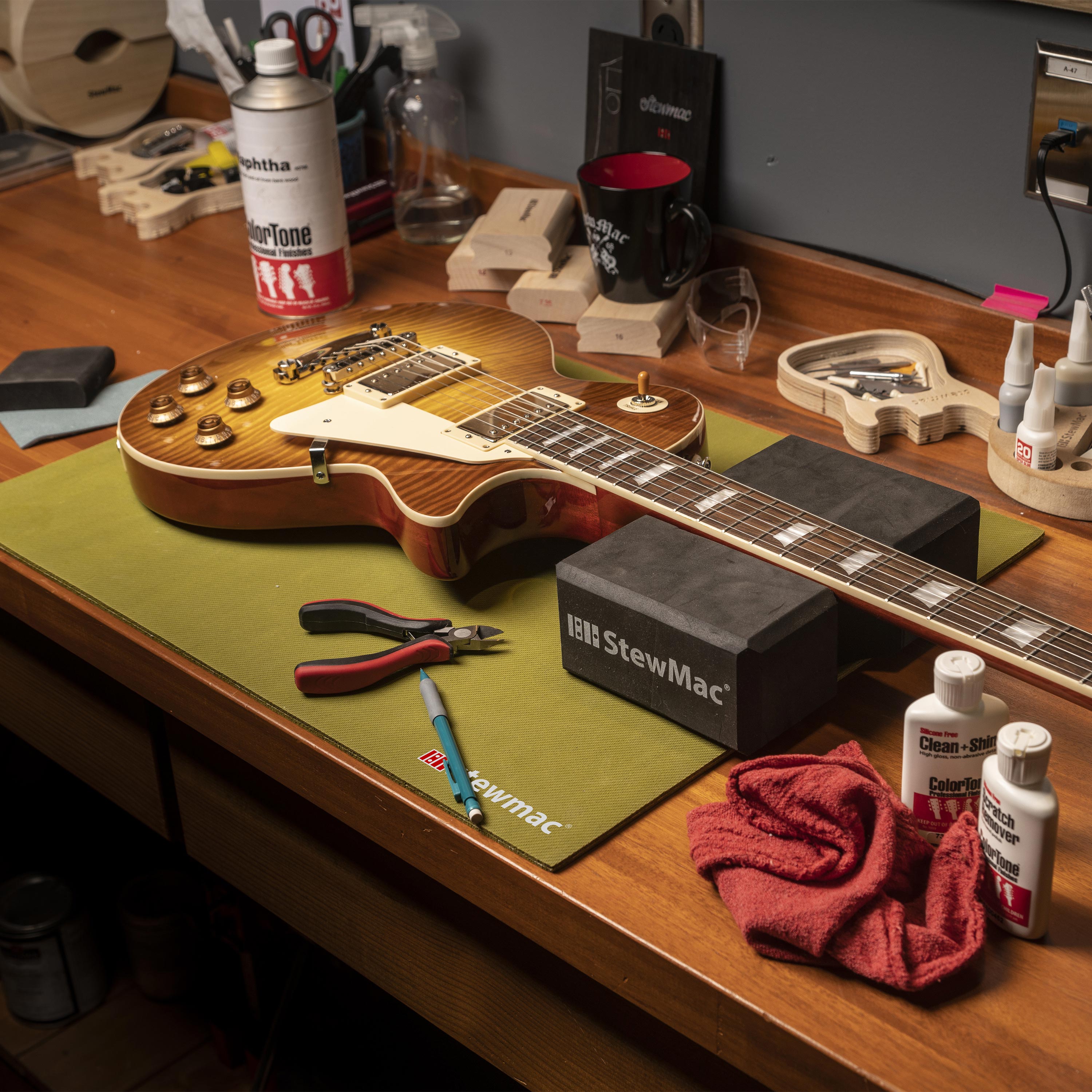 Es algo sencillo, pero un soporte para mástil es una de las herramientas más importantes de su tienda. Es una parte esencial de cualquier cambio de cuerdas, trabajo en la electrónica, limpieza, etc.