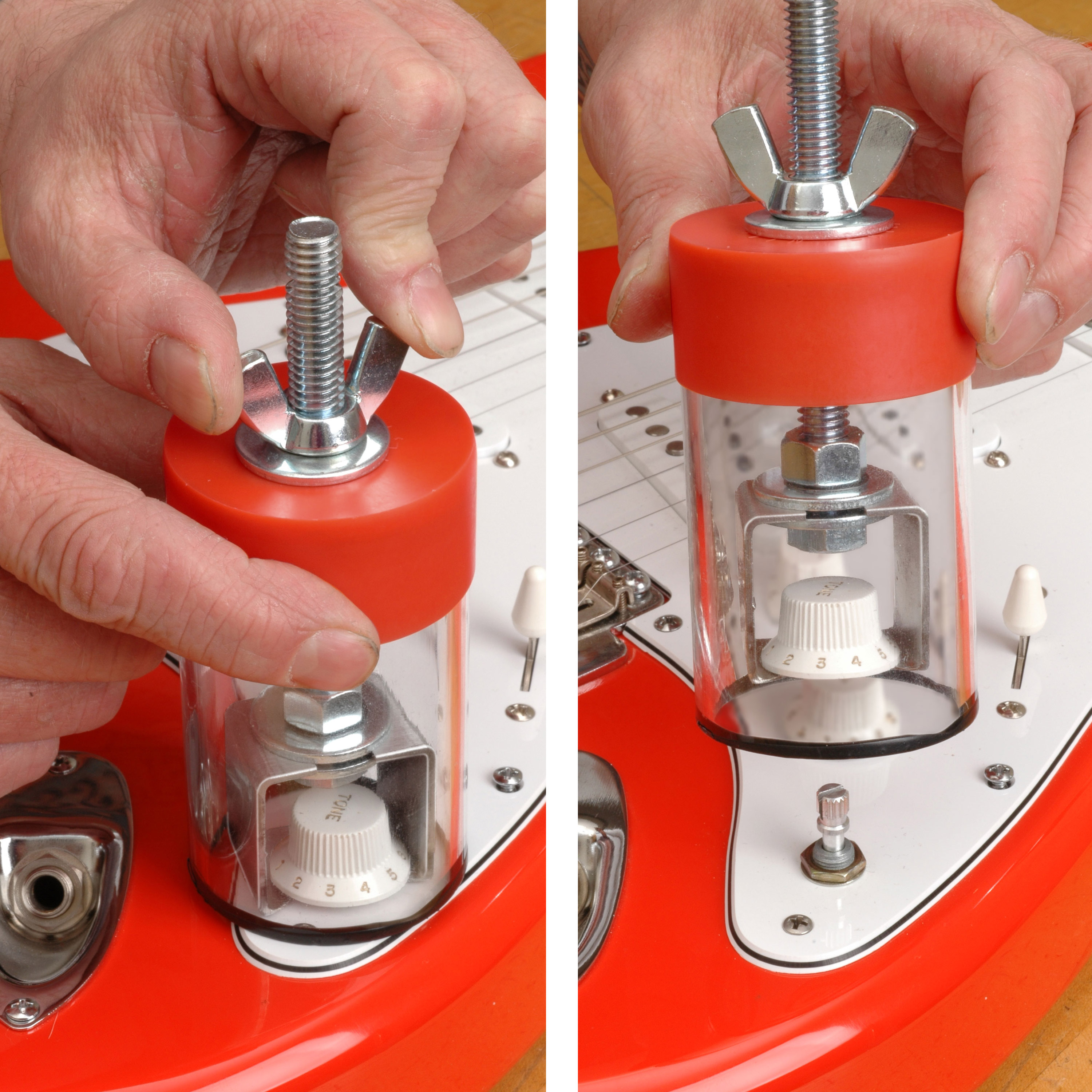 ¿Perillas de guitarra difíciles de quitar?La carcasa acrílica transparente del extractor de perilla y casquillo tiene una base de goma para ayudar a proteger el acabado de la guitarra. Incluye herrajes para extraer fácilmente el puente Gibson, Schaller o Gotoh y los casquillos de los pernos cordal, sin dañar la guitarra.