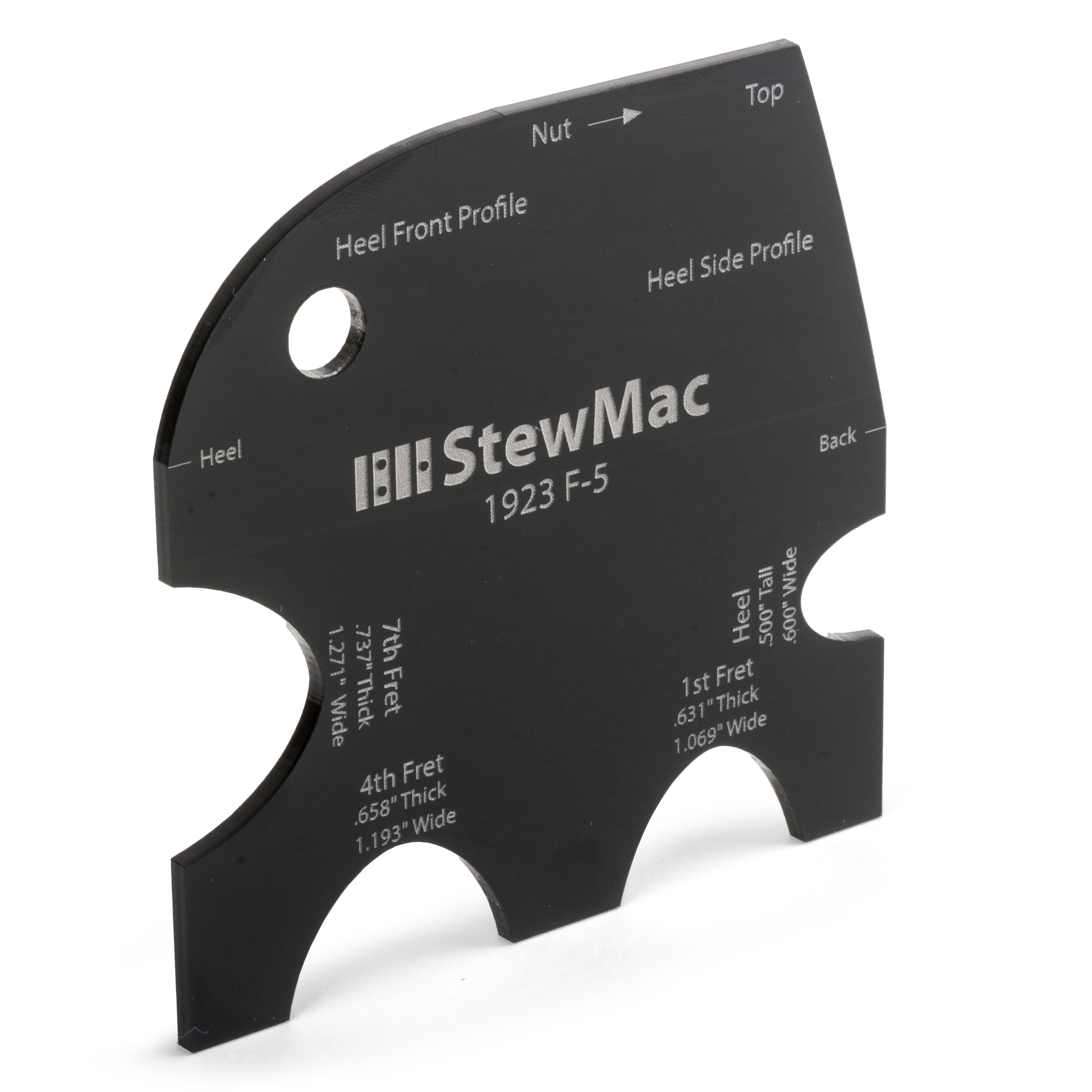 Todo lo que necesitas para hacer reproducciones perfectas de los cuellos más buscados. Estas plantillas tienen los contornos exactos de la parte posterior del mástil de la primera, cuarta y séptima trastes, y varias formas de talón. También medimos el grosor del mástil desde la parte inferior del diapasón y grabamos las mediciones en la herramienta. Tienes todas las dimensiones a mano para conseguir que tu mástil sea exactamente el adecuado.