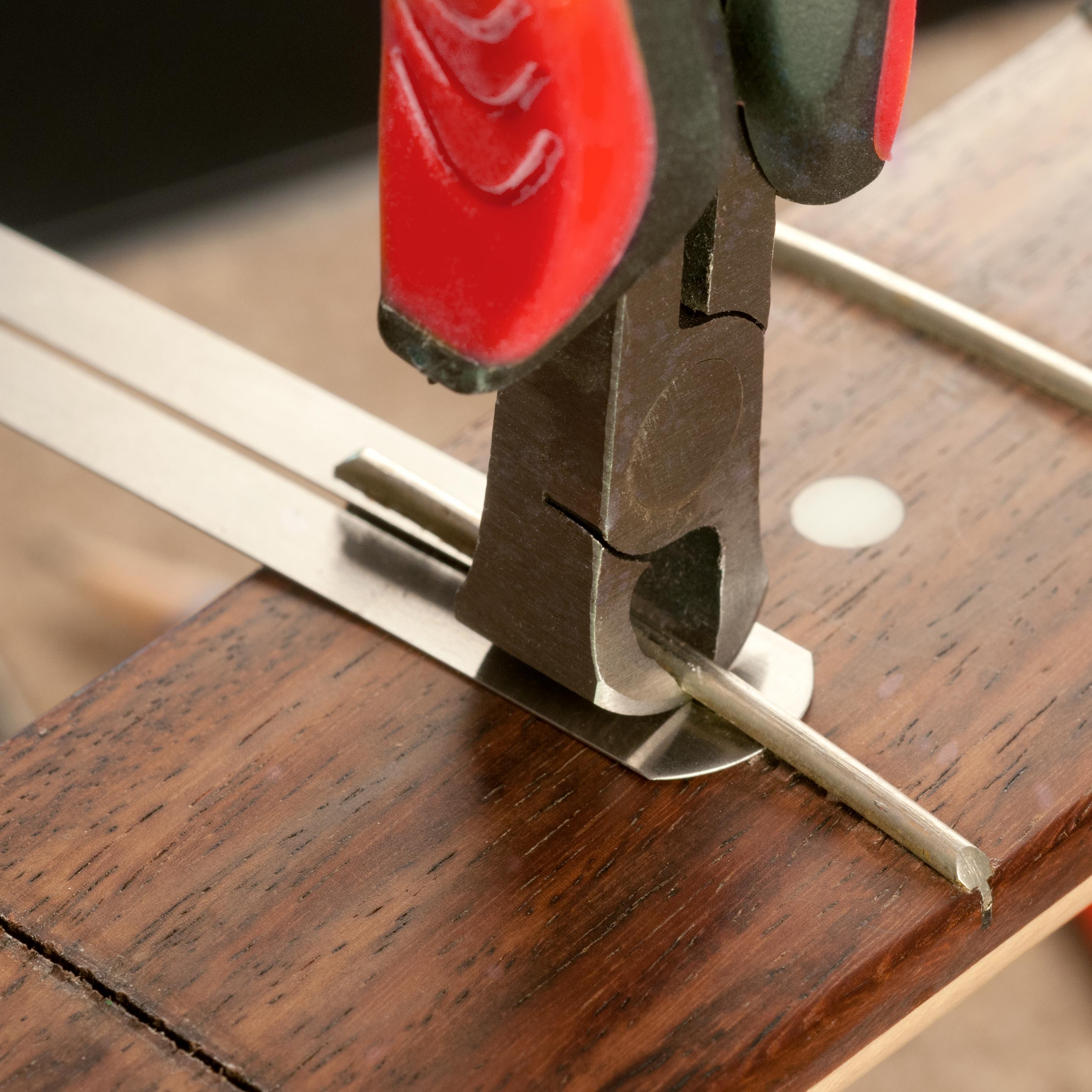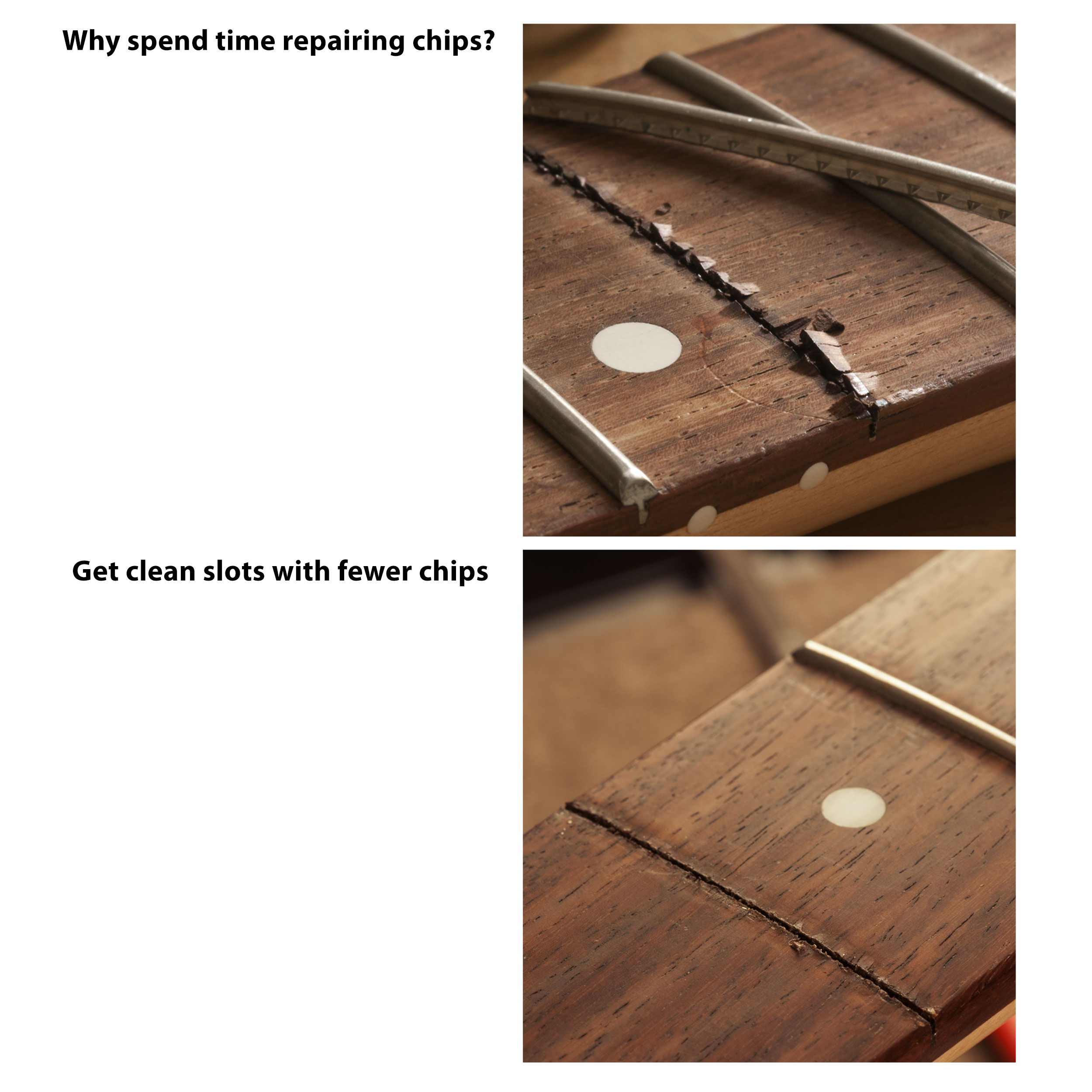 Chip Stoppers presione hacia abajo el diapasón mientras Extractor de trastes saca los trastes. Obtiene menos virutas y refrescos más limpios. Demasiado mal que no pensáramos en esto hace veinte años, ¡imaginemos las horas que todos habríamos ahorrado!
