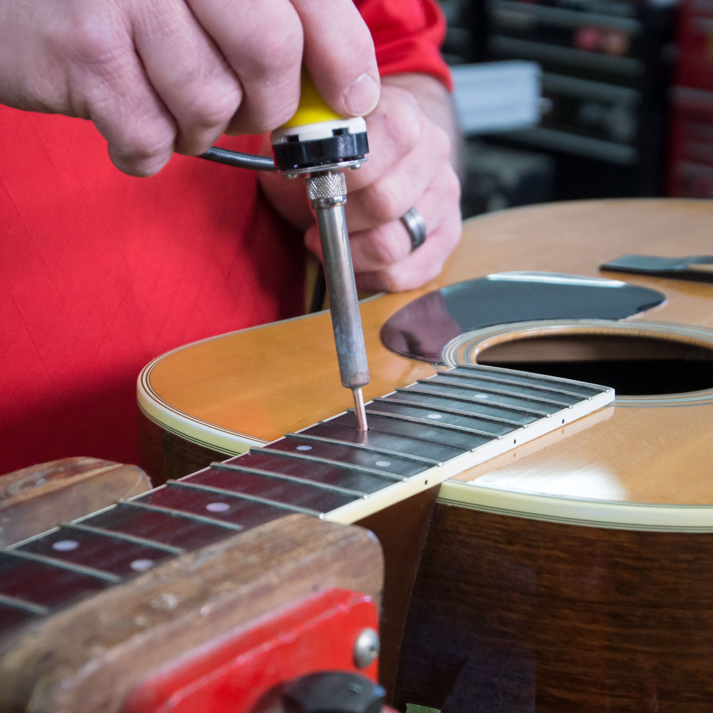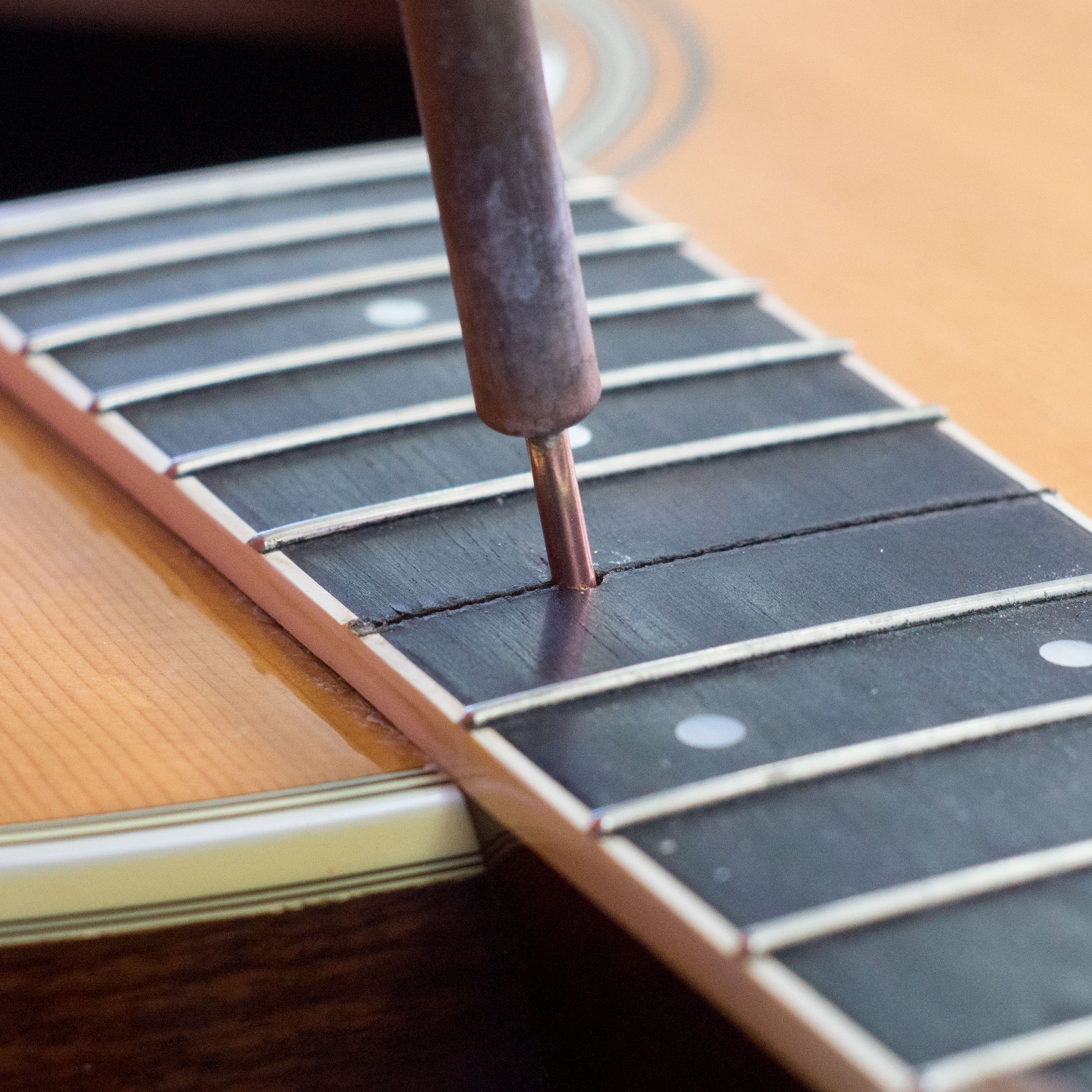 El revolucionario HeatStick suaviza el pegamento sin enjuagar los acabados delicados ni aflojar el bloque del mástil o varetas como el vapor. Es fácil de controlar y se puede utilizar para guitarras y mandolinas acústicas y eléctricas. El HeatStick es de 6" de cobre sólido e incluye dos brocas para taladrar el piloto y los orificios de acceso a través del tablero.