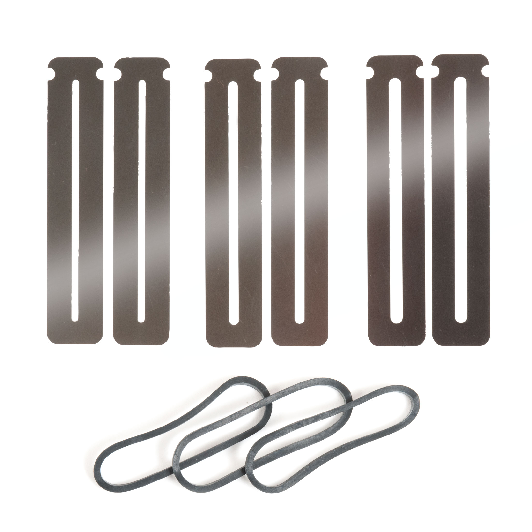 Cada una de estas prácticas protecciones se coloca sobre un traste para limar y pulir de forma segura, para ayudar a mantener su fretboard limpio y sin arañazos. Están hechos de acero inoxidable flexible de 0,010" para mayor durabilidad y una vida útil prolongada.