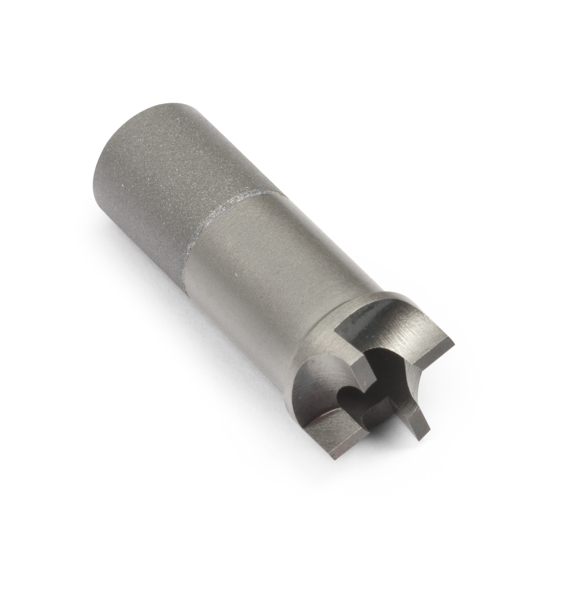 En un mástil de bala de guardabarros, el orificio de acceso de la varilla de alma es ligeramente más pequeño que nuestro cortador de alivio de 3/8". Coloque esta punta piloto en el cortador de alivio para centrarla durante las primeras vueltas. Una vez establecido el canal de 3/8", retire el piloto y continúe sin él.