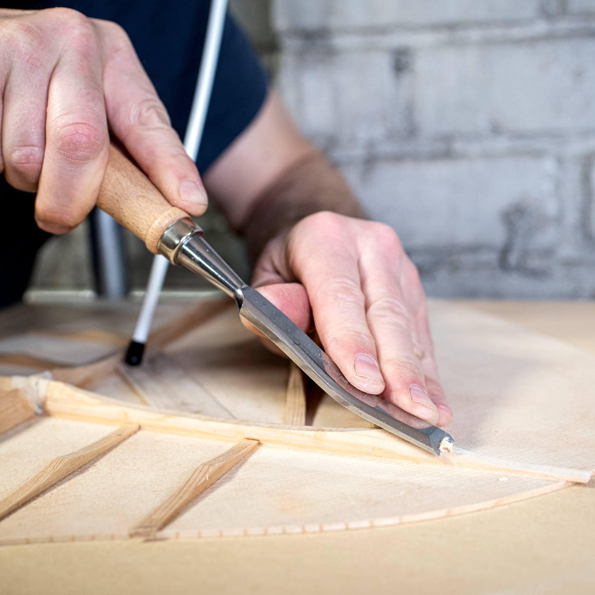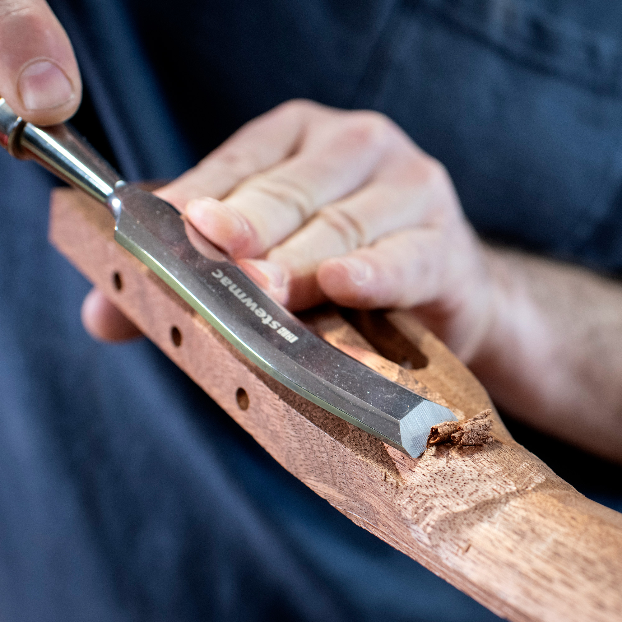 Su exclusiva forma en “S” es perfecta para cortar al ras y para dar forma a los extremos curvos de las varetas de guitarra. También lo usamos para moldear mástiles, tacones y mucho más. Además, facilita la limpieza de restos de cola, ya que permite llegar a zonas por encima, por debajo y alrededor del pegamento seco donde los formones rectos no llegan.