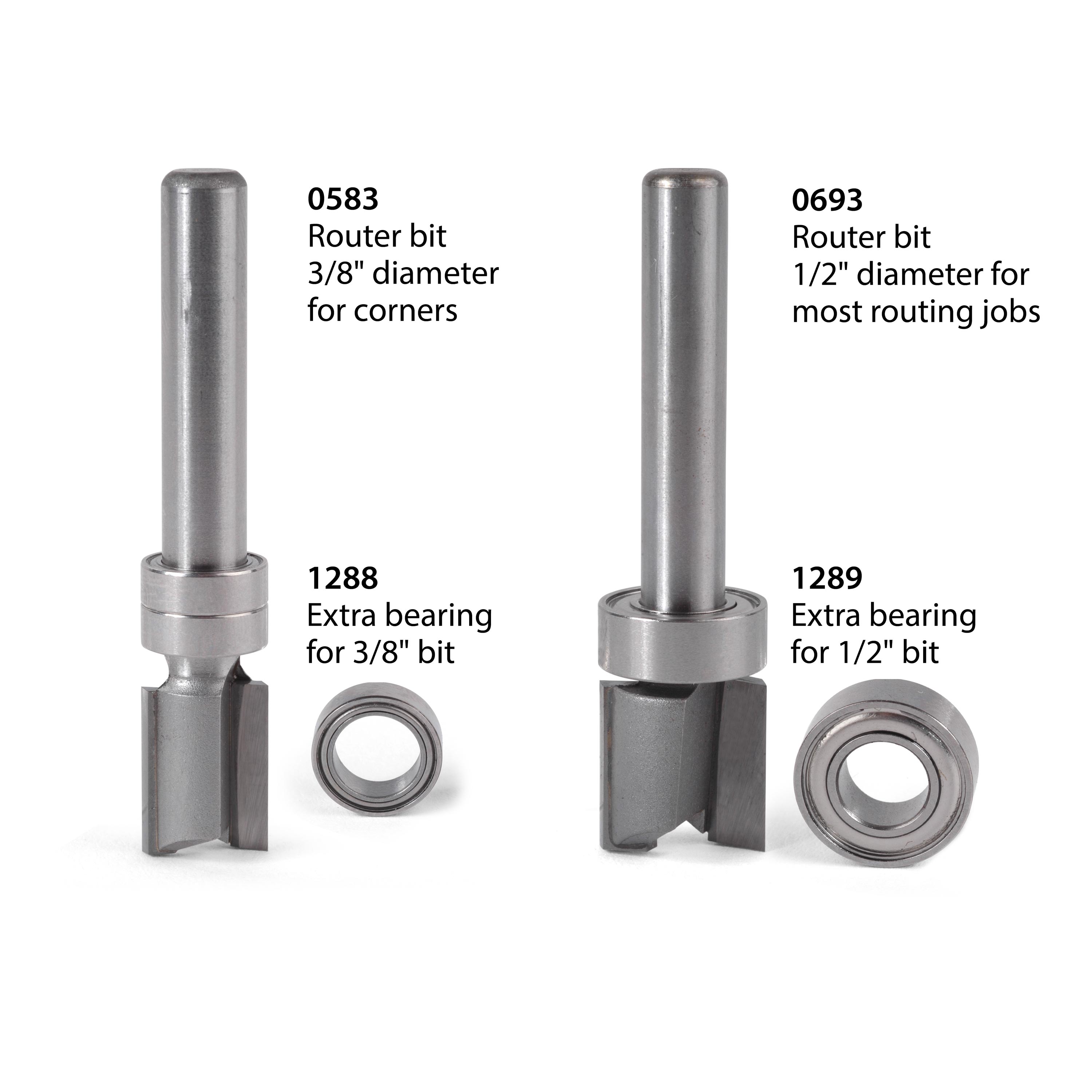 The 1/2" diameter bit is recommended for most of your routing chores, and comes with 1 bearing. Use the 3/8" cutter only for routing corners that need the tighter radius, it comes with 2 bearings.