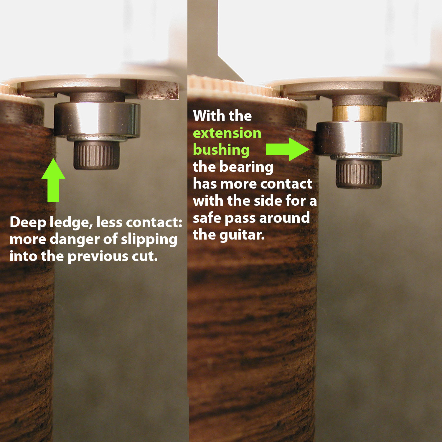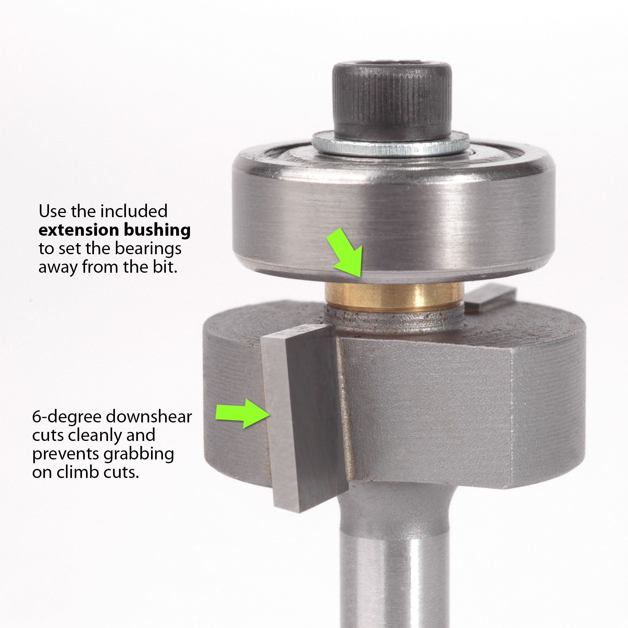 Nuestra fresa con punta de metal duro de corte limpio tiene un mango de 1/4" para ajustarse a su enrutador, un tornillo Allen con llave para instalar un cojinete de profundidad de corte y un casquillo de extensión especial para salientes de "escalón".