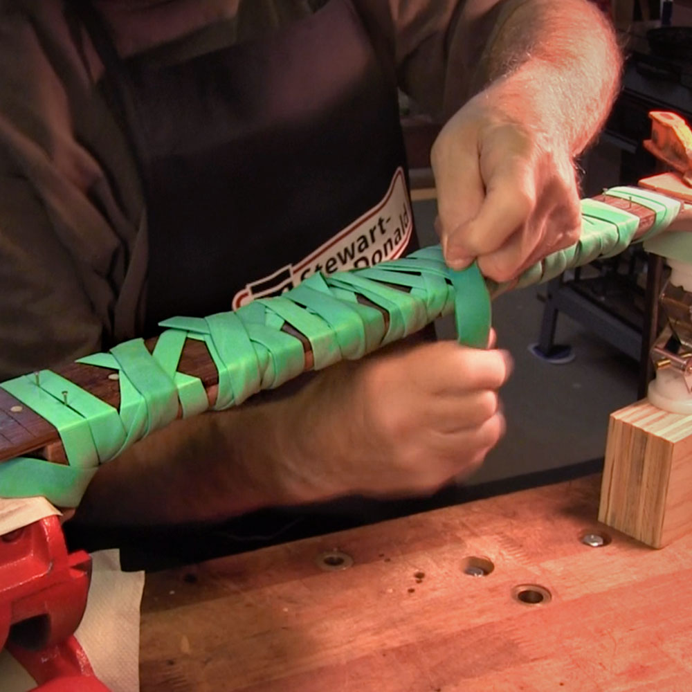 Las bandas anchas son una versión más pesada que nos gusta para pegar un diapasón a un mástil sin colocar engorrosas abrazaderas y calabozos. Tirando por igual de ambos lados, ayudan a centrar el diapasón en el mástil. Envuélvalos tan bien como necesite; estas bandas son muy fuertes. Una banda es todo lo que se necesita para pegar un diapasón al mástil.
