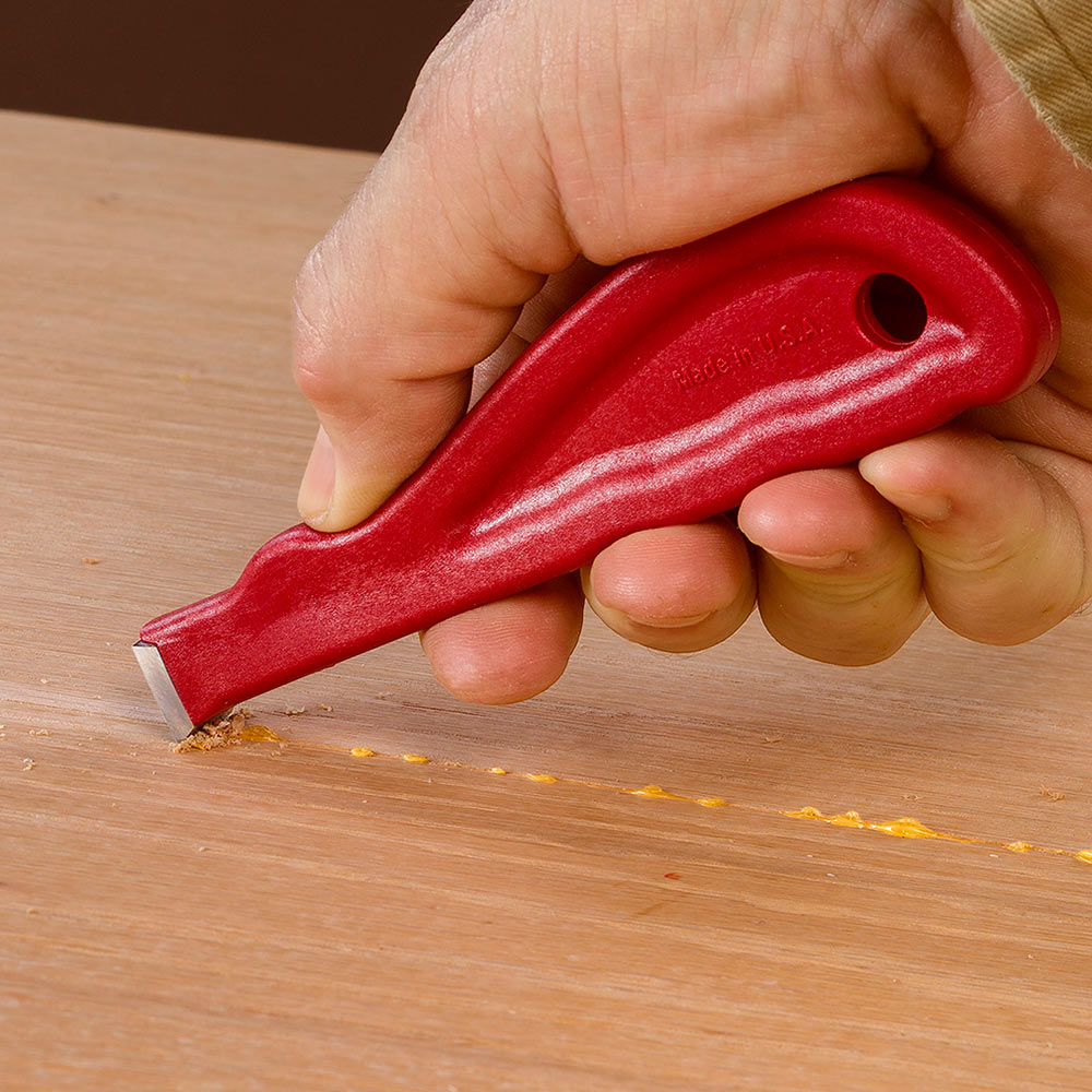 La potente bruñidor mini Woodpecker destaca en la eliminación de pegamento. La resistente cuchilla de metal duro saca el pegamento seco más duro de su trabajo.