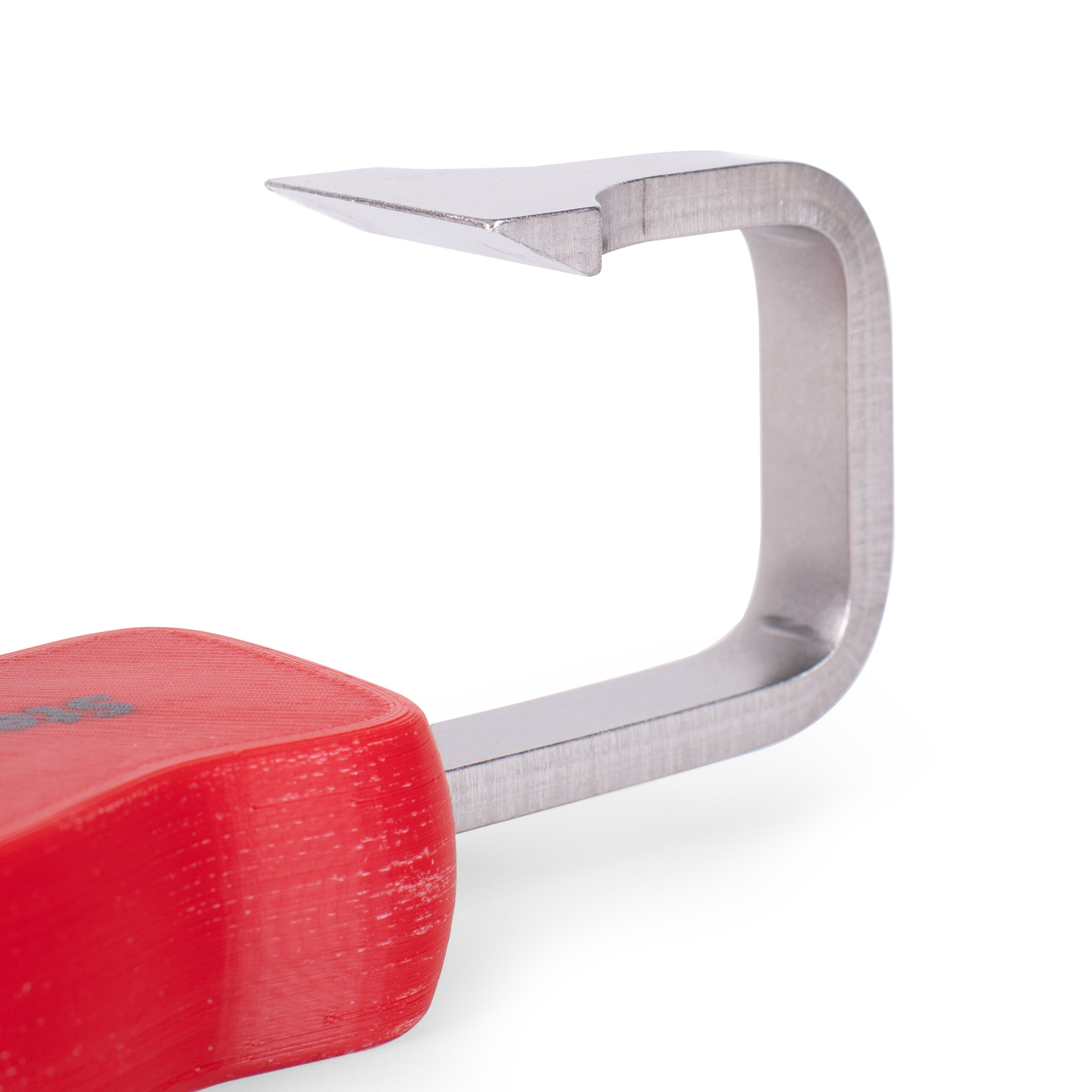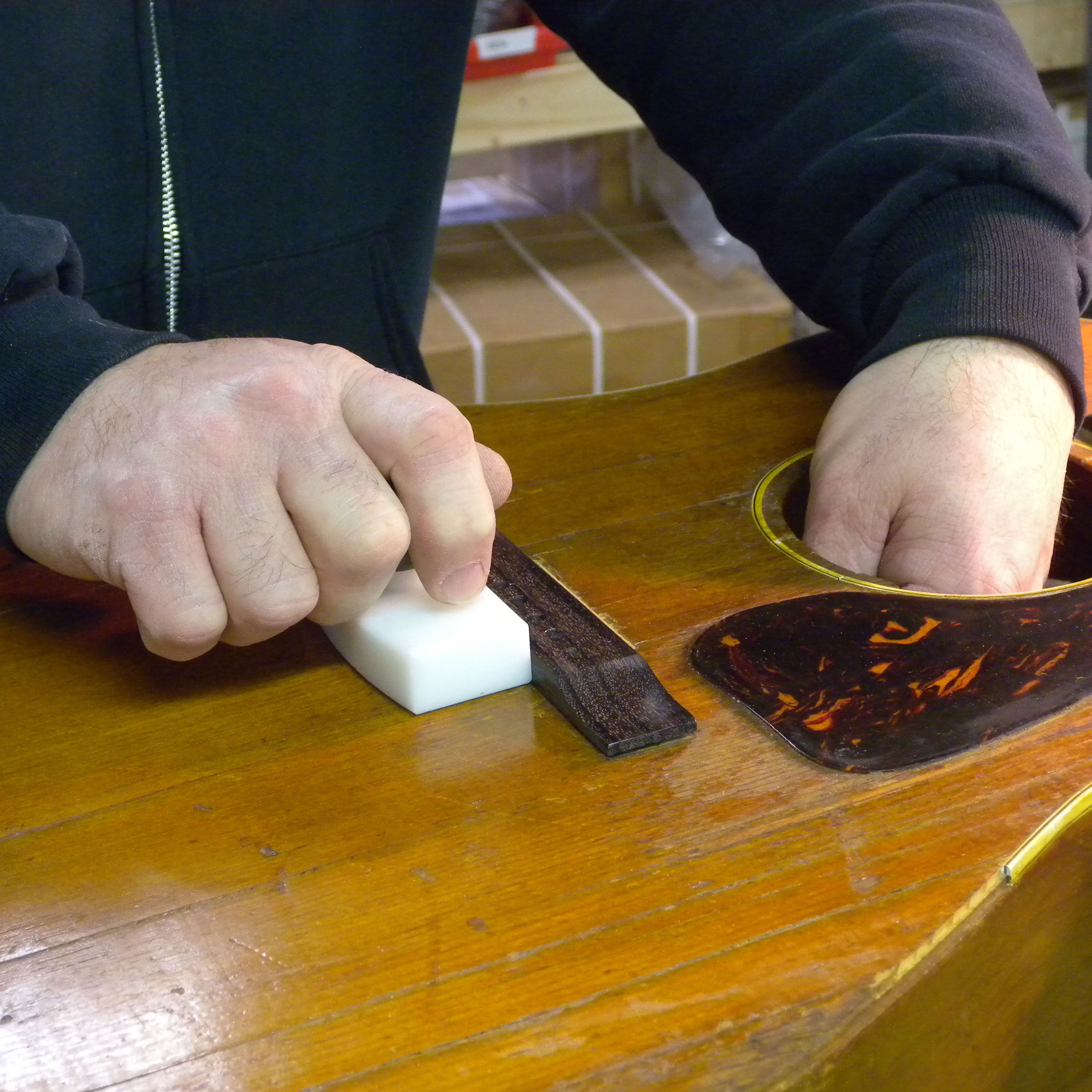 . Retirar la placa del puente de una guitarra acústica es complicado. Después de suavizar el pegamento con calor, se necesita una fuerza cuidadosamente controlada para separar la placa de la delicada parte superior de la guitarra. Al mismo tiempo, debe proteger la parte superior de las grietas bajo presión. Nuestro cincel de placa puente y la plataforma de soporte superior trabajan juntos para lograrlo.