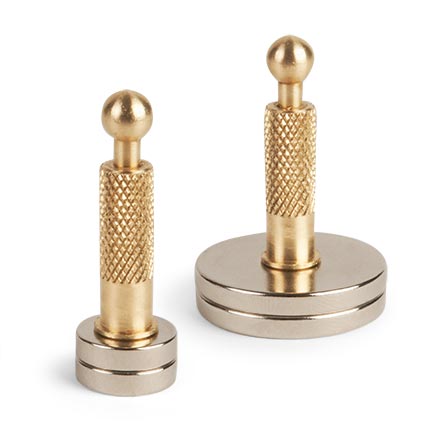 También se incluyen dos Manijas de imán que facilitan la recogida, colocación y separación de estos potentes imanes. Basados en una idea de Al Rorick en nuestra tienda de I+D, están hechos de latón estriado, 1-3/16" de largo, con tornillo de fijación. Cada mango contiene uno o dos imanes, según sea necesario.