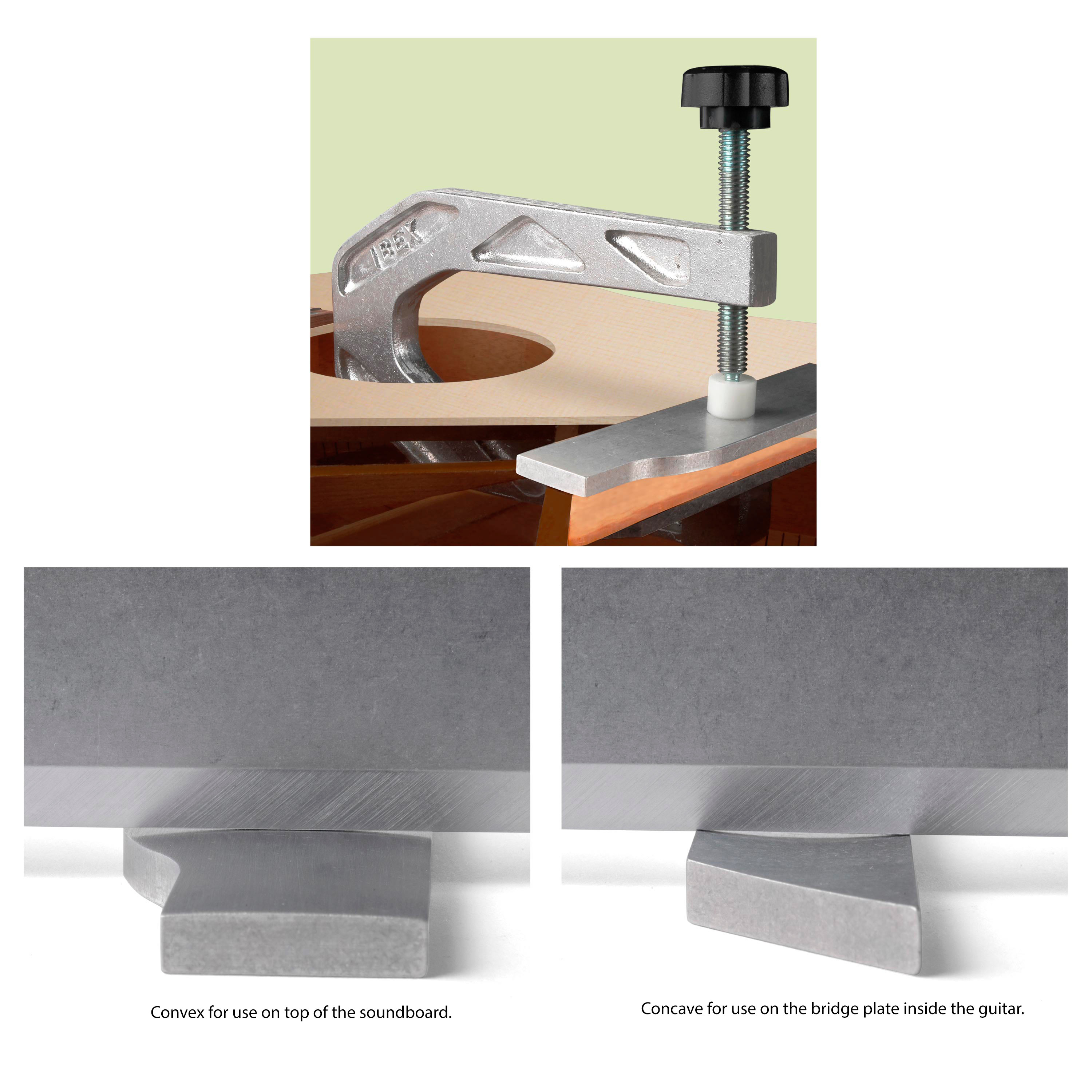 Están diseñados para su uso con el puente retirado del instrumento y son eficaces para placas de puente que se han instalado con pegamento de cola en escamas, pegamento alifático (amarillo) o pegamento PVA (blanco). Simplemente haga coincidir los aplanadores adecuados con su guitarra, caliéntelos a 150 grados F, humedezca la madera en el área del puente y la placa del puente, y sujete los aplanadores en su lugar durante aproximadamente un día.