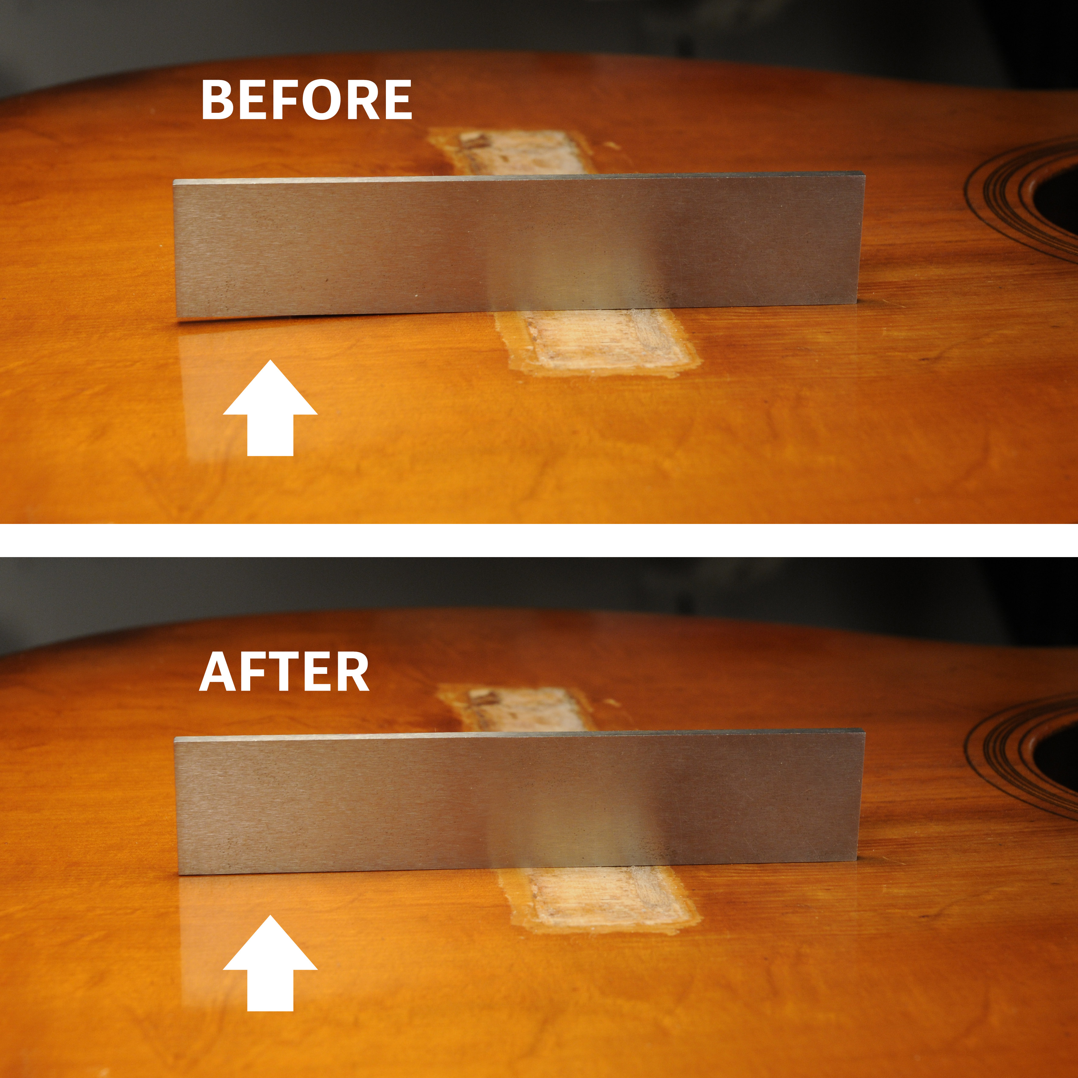 Un "vientre" excesivo en la lista de sonidos, causado por la tensión de las cuerdas, puede hacer que una guitarra acústica sea difícil de tocar. Incluso puede dañar la parte superior, la placa del puente y el puente. La sustitución de la placa puente original para corregir el problema es un trabajo que lleva mucho tiempo y que, lamentablemente, puede reducir el valor de un instrumento antiguo.