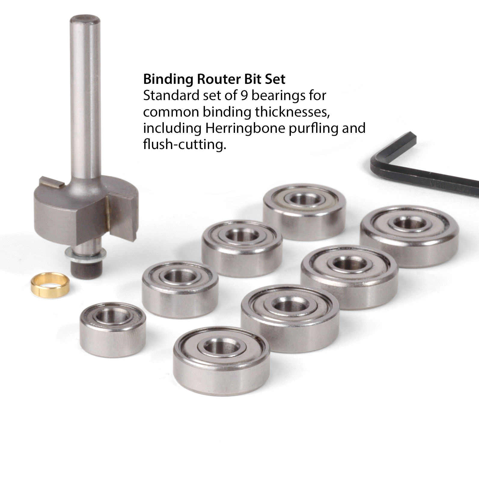 AHORRE cuando compre este juego TrueChannel que incluye nuestro juego de bits de enrutador de unión #1298. Diseñado especialmente para luthiers, el juego cuenta con una punta de metal duro muy afilada con eje de 1/4 in y rodamientos personalizados para cortar los anchos de binding más comunes.