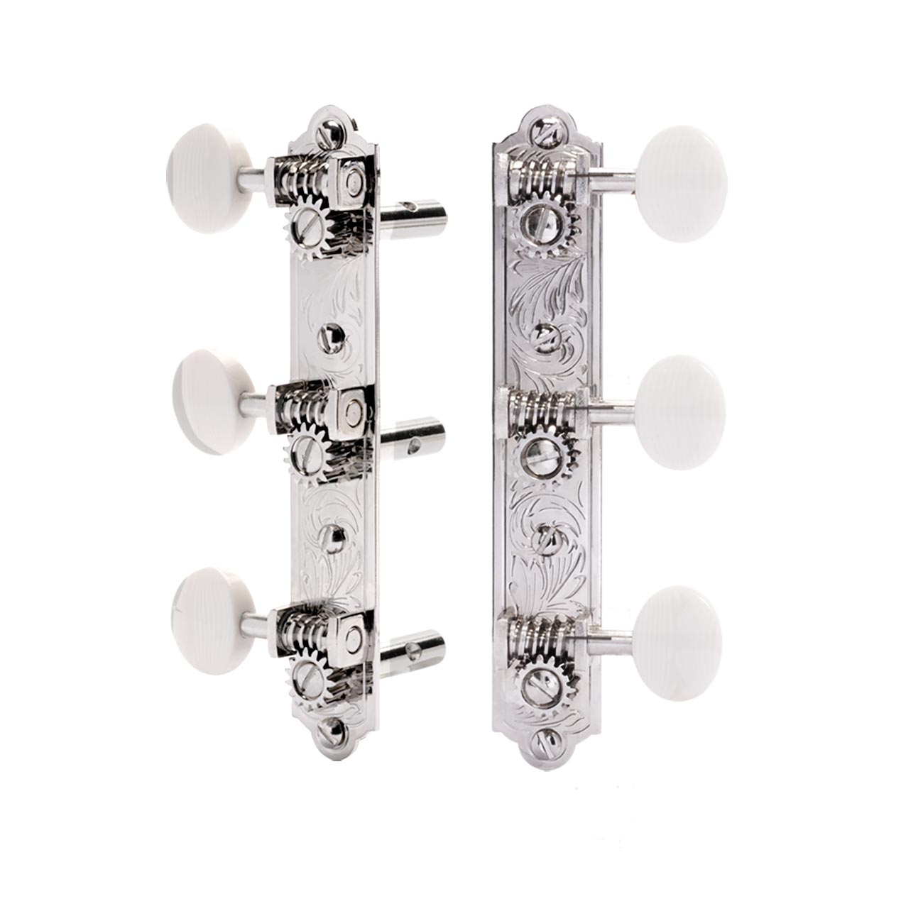 ¡Los clavijeros de antes de la guerra renacen! Nuestros 3-on-plateclavijeros con tres réplicas con un distintivo motivo grabado, suministrados por Waverly a los fabricantes de guitarras desde el 20 hasta el 40s.
