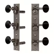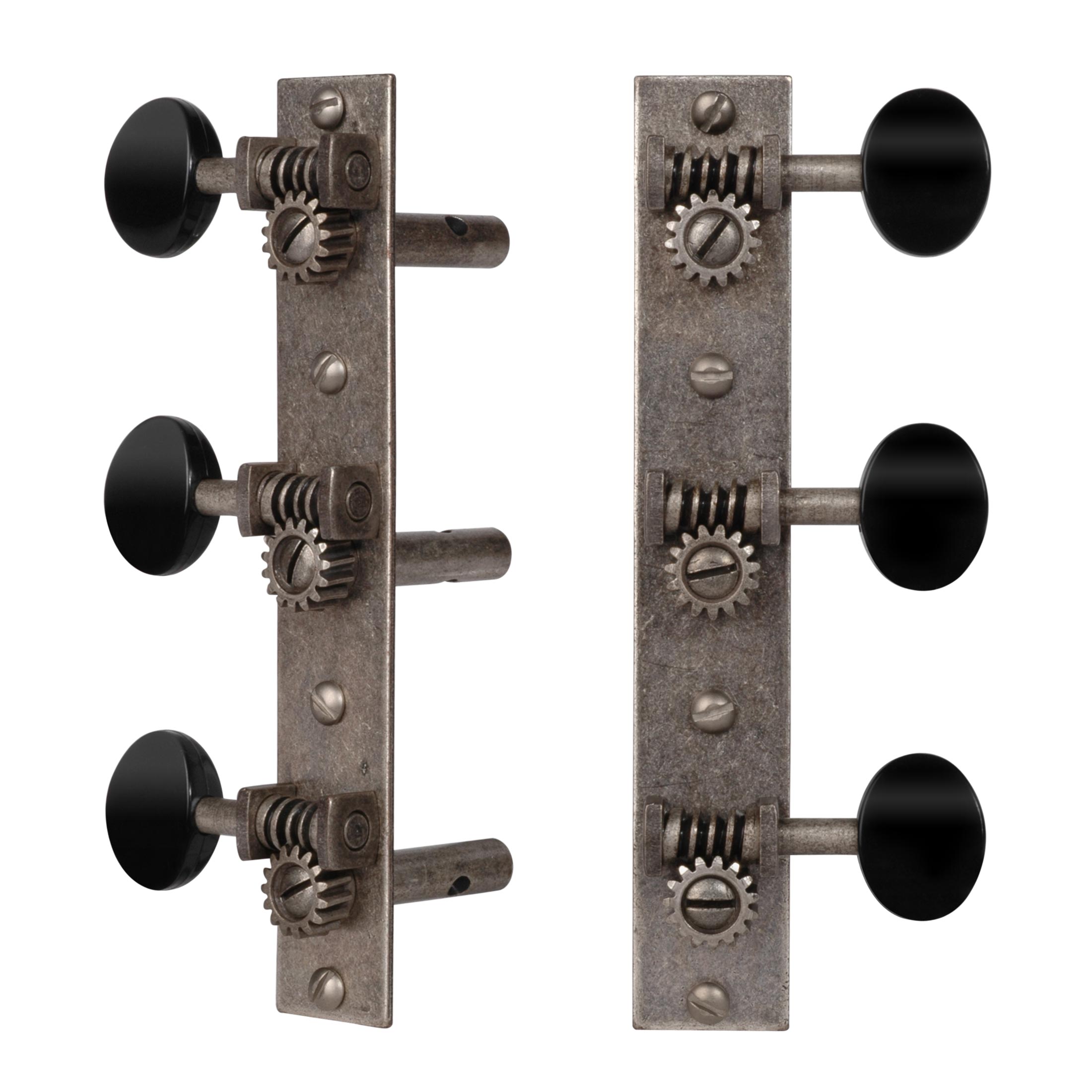 ¡Los clavijeros de estilo preguerra renacen!Nuestros tres 3-on-plate clavijeros de réplica con soportes de tornillo sin fin cuadrado en placas rectangulares de acero. Su relación de 15:1 cambio mejorada proporciona un mejor ajuste que los originales, y nuestro popular acabado de níquel relic complementa el hardware vintage. Disponible con botones de plástico negro o crema en forma original.