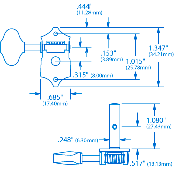 Cada sintonizador cuenta con una relación de 18:1 engranajes para un ajuste fino, una placa base fundida, perillas escalopado de estilo vintage, rodamientos de gusanos de nailon y tornillo de tensión para un funcionamiento suave.Juego de 6 (3 izquierdas/3 derechas) con tornillos de montaje. Los postes de cadena tienen un diámetro de 1/4" (6,32 mm).
