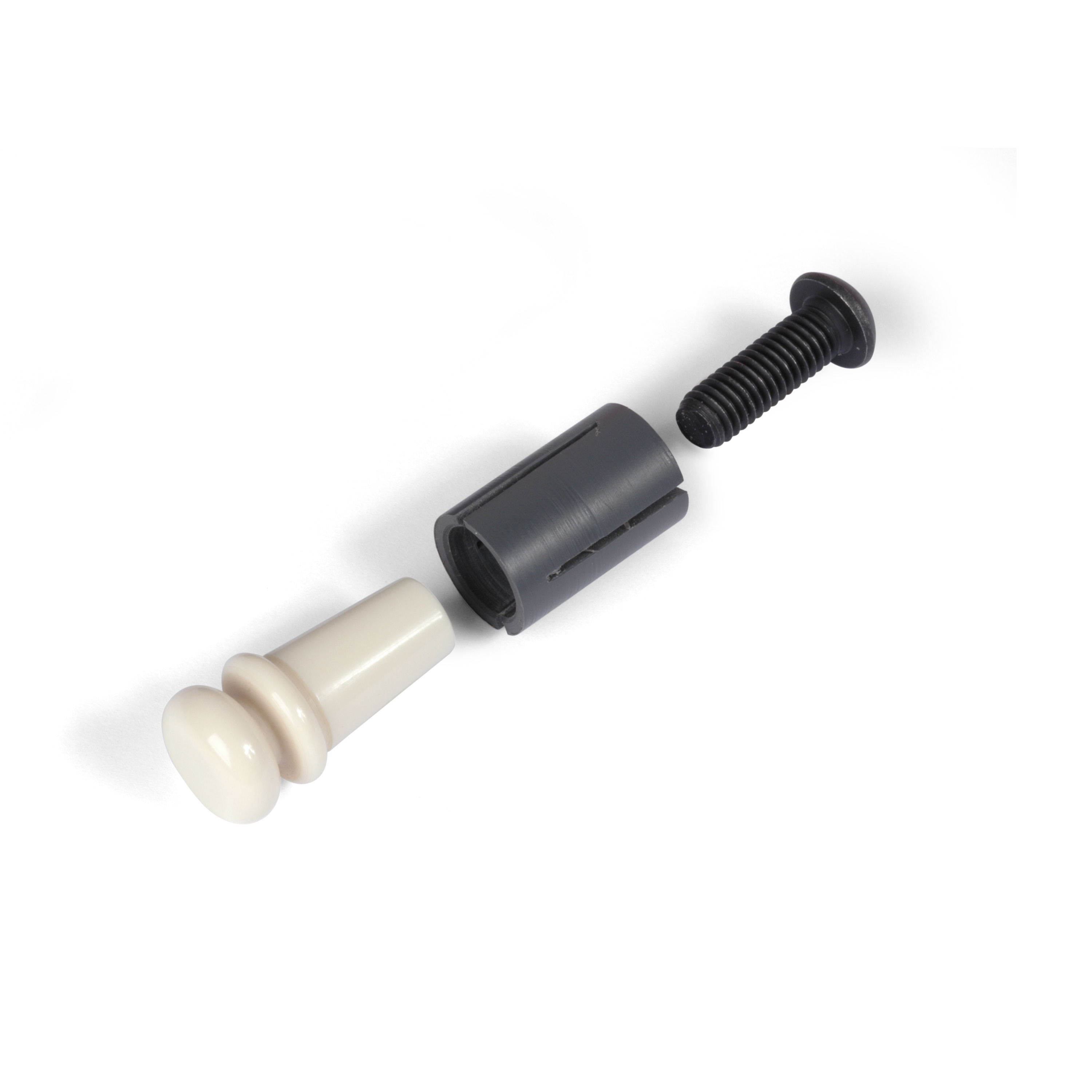 El pasador se desliza en el manguito de expansión de plástico de 3/4" de largo y se ajusta desde el interior de la guitarra con el tornillo metálico negro suministrado. 5/32Se requiere una llave Allen de in (4mm).