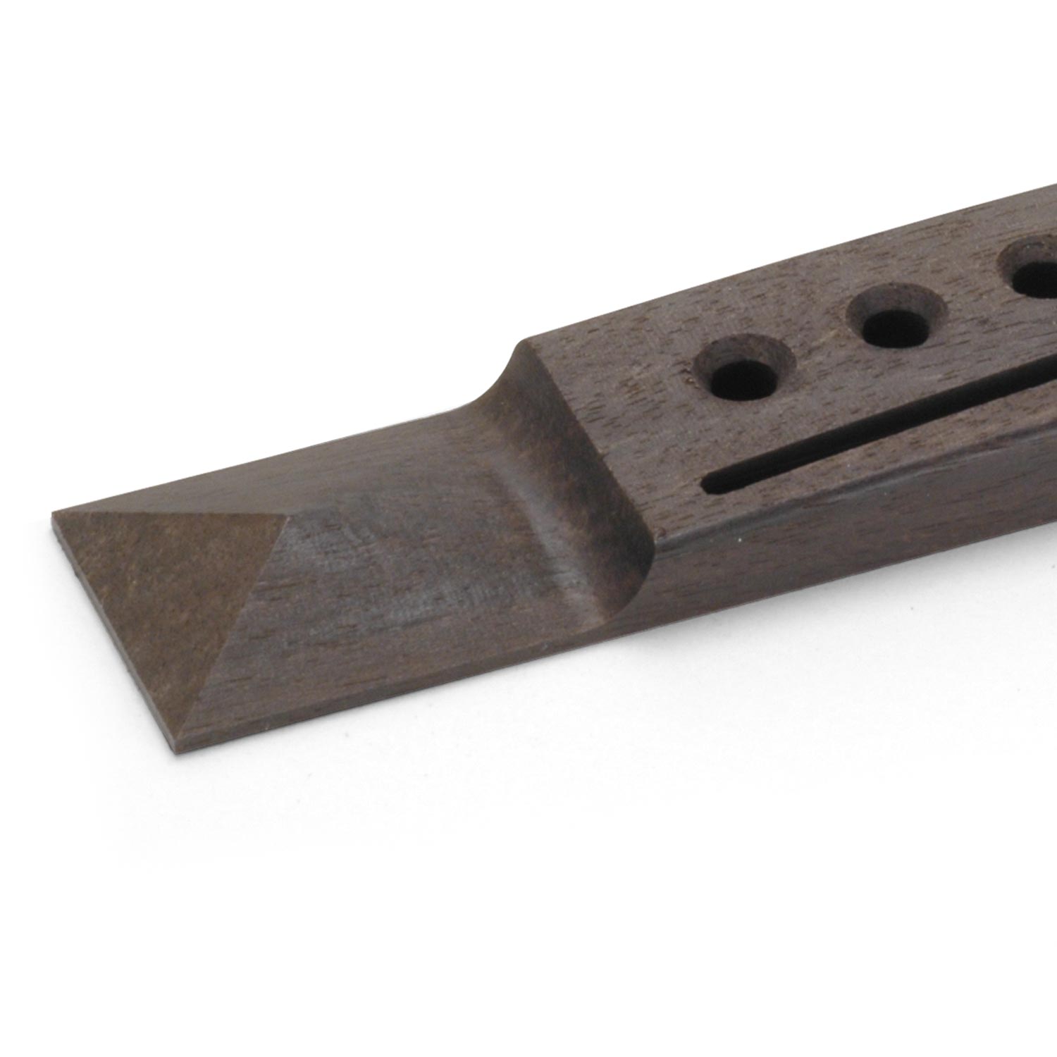Está hecha de ébano sin pulir y mide 6" x 1" x 0,350". A diferencia de un puente vintage, la ranura del silleta (3/32" de ancho x 2-7/8") está angulada para mejorar la entonación, y los orificios de los pasadores del puente están alineados paralelos a la ranura. Los orificios están avellanados y parcialmente perforados para una espaciado de cuerdas de 2-5/16". Sillón no incluido.
