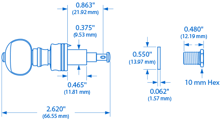 Para cabezas de clavija de 7/16" a 3/4" (11,11 mm x 19,05 mm) de grosor. Se requieren orificios de clavijero de 3/8" de diámetro. El casquillo hexagonal roscado incluye una arandela para ayudar a proteger el acabado de pala . Juego de 4.